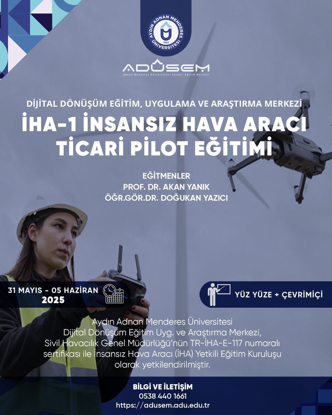 🔥Aydın Adnan Menderes Üniversitesi Dijital Dönüşüm Eğitim Uygulama ve Araştırma Merkezi, 20 Ocak 2025 tarihi itibarıyla T.C. Ulaştırma ve Altyapı Bakanlığı Sivil Havacılık Genel Müdürlüğü tarafından verilen TR-İHA-E-117 numaralı sertifika ile İnsansız Hava Aracı (İHA) Yetkili Eğitim Kuruluşu olarak yetkilendirilmiştir.
