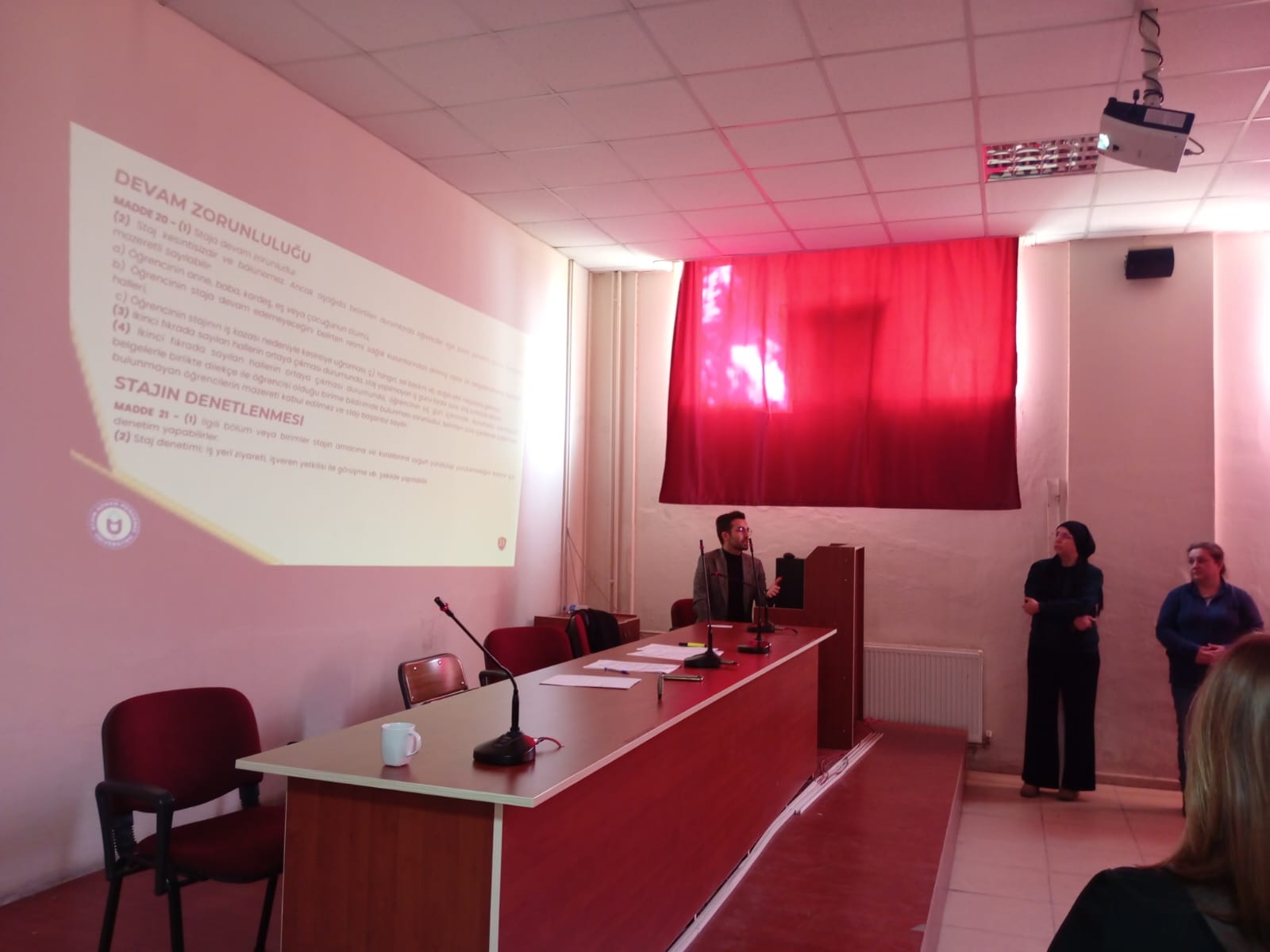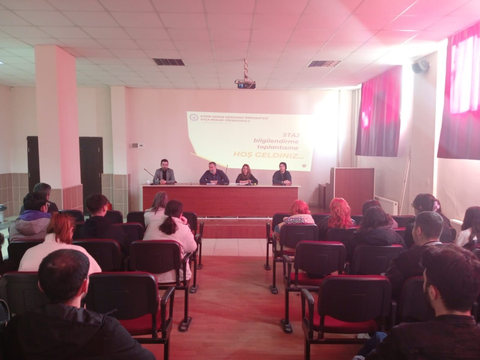 Staj süreçleri, dikkat edilmesi gereken hususlar ve öÄŸrencilere saÄŸlanacak desteklerin detaylı bir ÅŸekilde ele alındığı toplantıda; öÄŸrenciler, sunumlar aracılığıyla staj prosedürleri ve uygulamaları hakkında bilgilendirildi.