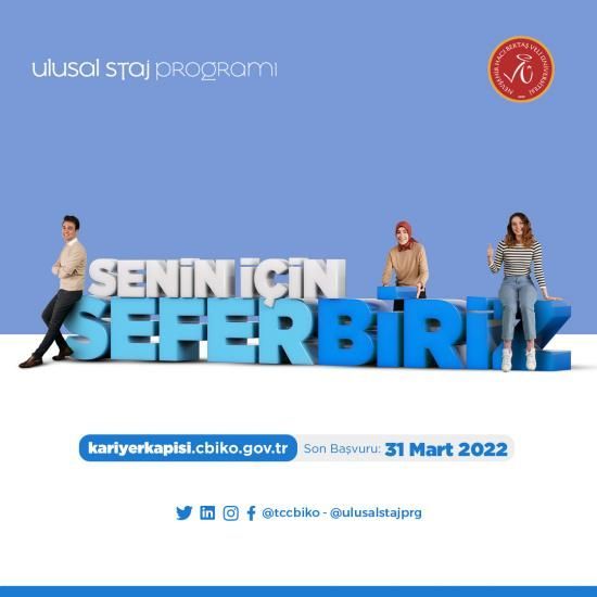 T.C. CumhurbaÅŸkanlığı İnsan Kaynakları Ofisi koordinasyonunda, tüm kamu kurumları ve özel sektörden gönüllü iÅŸverenlerin katılımı ile yükseköÄŸretimde iki yıldır baÅŸarıyla sürdürülen Staj SeferbirliÄŸi Programı'nın kapsamı 3. yılında, ülkemizin istihdam politikaları paralelinde geniÅŸletilmiÅŸ ve adı “ULUSAL STAJ PROGRAMI” olarak deÄŸiÅŸtirilmiÅŸtir.