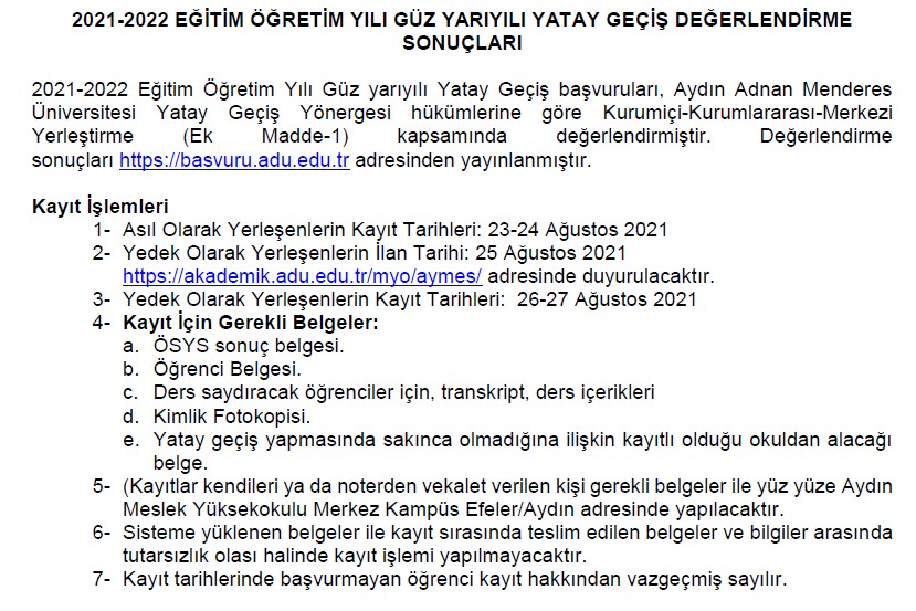 YATAY GEÇİŞ DEĞERLENDİRME SONUÇLARI