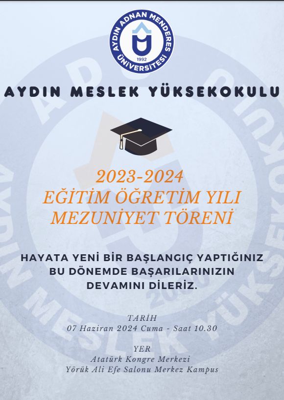 2023-2024 AKADEMİK YILI MEZUNİYET TÖRENİ 7 HAZİRAN CUMA SAAT 10.30 DA ATATÜRK KONGRE MERKEZİNDE-ADÜ YAPILACAKTIR