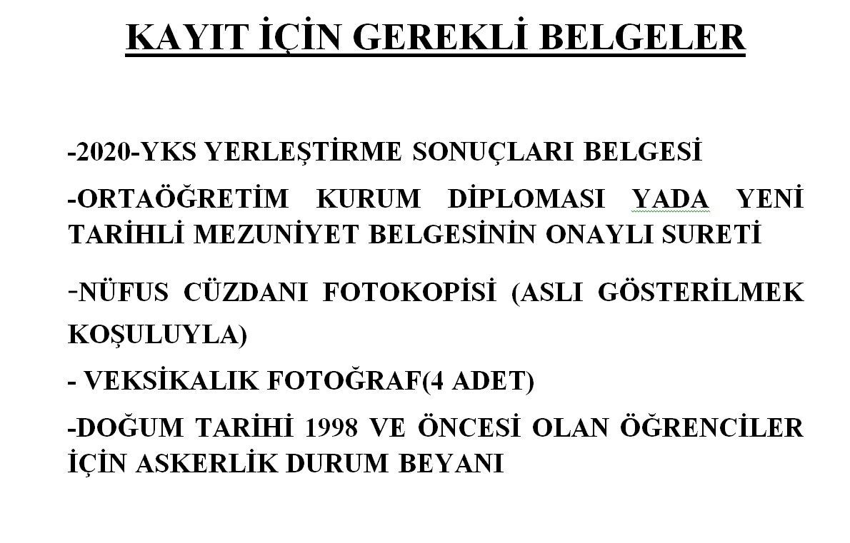 Bu bölüme kayıt yaptıracak olan öğrencilerimiz YKS yerleştirme klavuzunda yer alan BK.87. maddesi gereğince tam teşekküllü devlet hastanelerden veya üniversite hastanelerinden alacakları sağlık kurulu raporu nedeniyle yüz yüze kayıt yaptıracaklardır. Yüz yüze kayıt için gerekli evraklar ektedir.