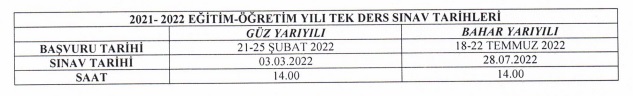 2021-2022 Eğitim-Öğretim Yılı tek ders sınav tarihleri aşağıdaki şekliyle kabul edilmiştir.