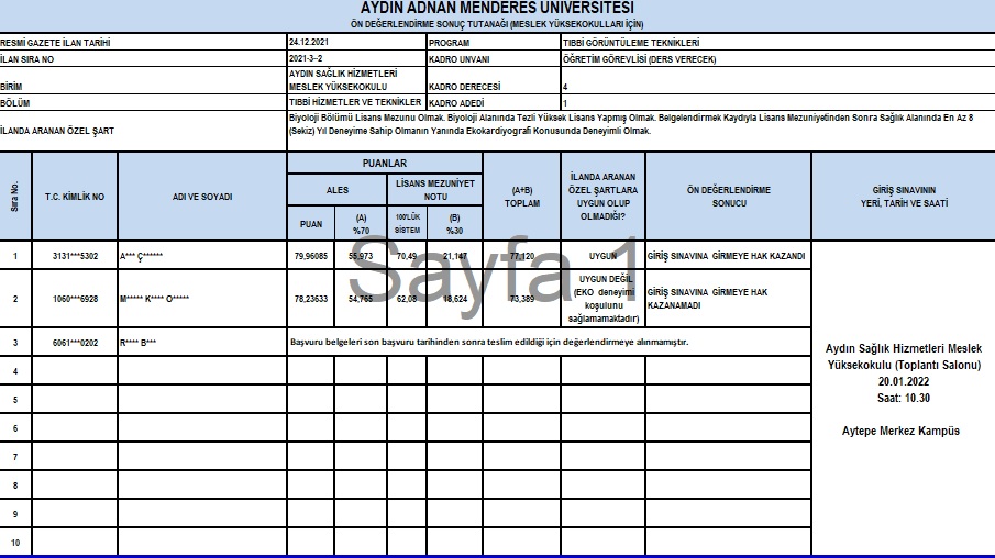 Tıbbi Görüntüleme Teknikleri Öğretim Görevlisi Kadro İlanı Ön Değerlendirme Sonucu