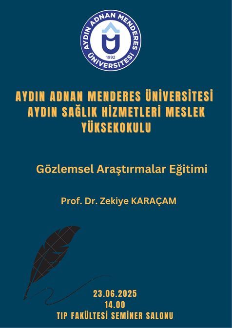 Aydın Adnan Menderes Üniversitesi Aydın Sağlık Hizmetleri Meslek Yüksekokulu tarafından düzenlenen “Gözlemsel Araştırmalar Eğitimi”, 23 Haziran 2025 tarihinde saat 14.00’te Tıp Fakültesi Seminer Salonu’nda gerçekleştirilecektir.