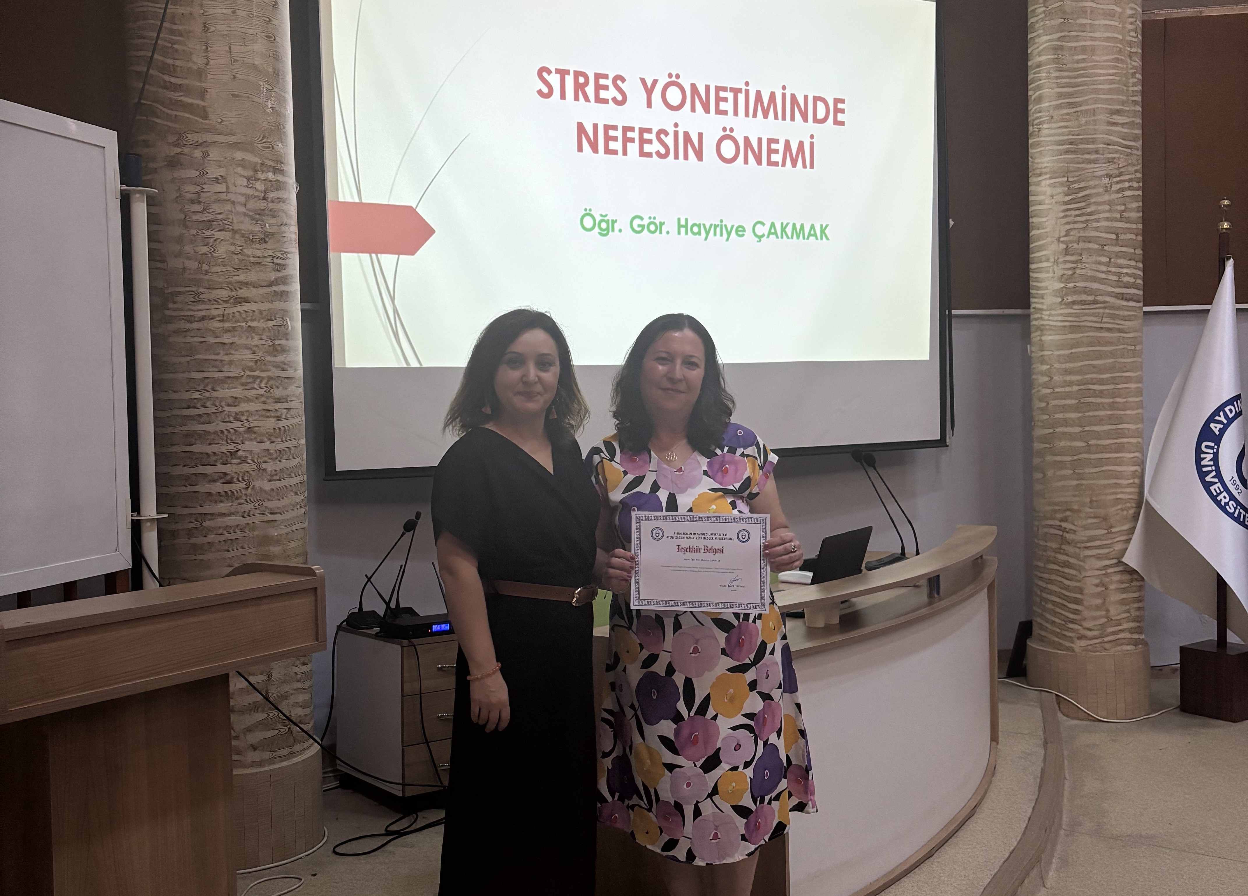 Aydın Adnan Menderes Üniversitesi Aydın Sağlık Hizmetleri Meslek Yüksekokulu tarafından düzenlenen “Stres Yönetiminde Nefesin Önemi” başlıklı etkinlik, 27 Haziran 2025 Cuma günü saat 14.00–16.00 arasında TÖMER Konferans Salonu’nda başarıyla gerçekleştirildi.