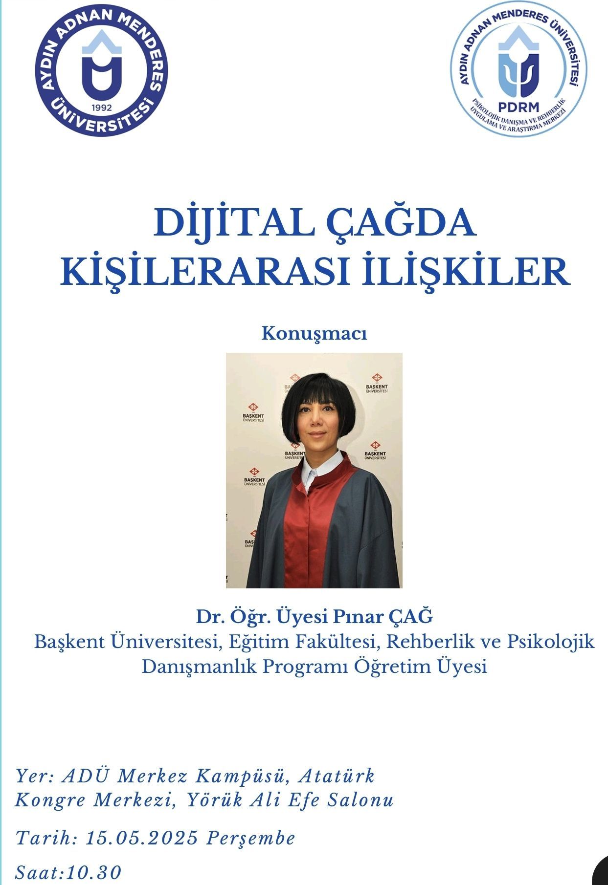 Aydın Adnan Menderes Üniversitesi (ADÜ) Psikolojik Danışma ve Rehberlik Uygulama ve Araştırma Merkezi (PDRM) tarafından “Dijital Çağda Kişilerarası İlişkiler” başlıklı bir konferans düzenlenecek.