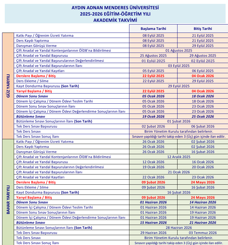 Aydın Adnan Menderes Üniversitesi 2025-2026 Eğitim-Öğretim Yılı akademik takvimi yayımlandı.