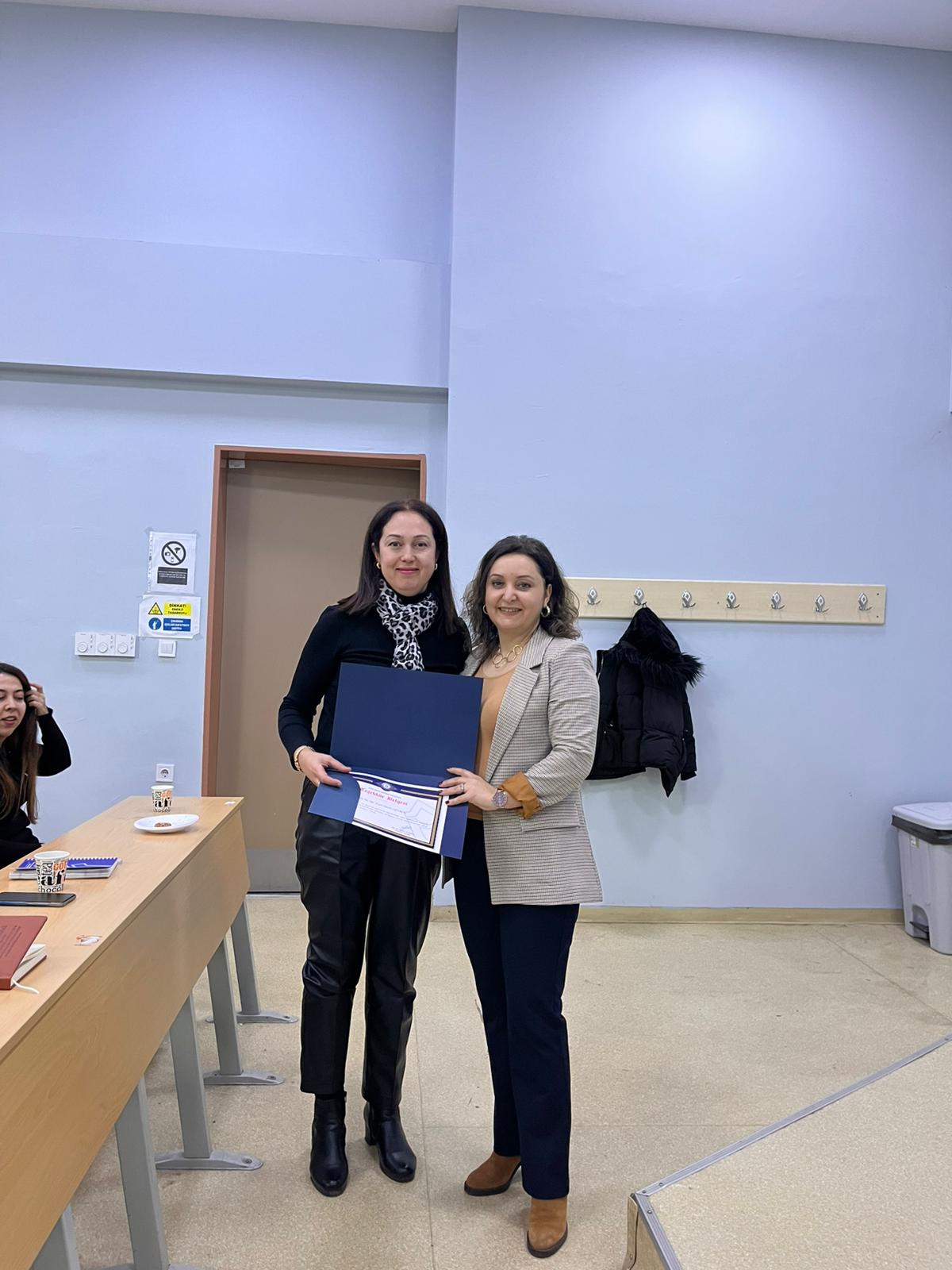 Akademik Performans Değerlendirme Formları kapsamında en yüksek puanı alan ilk üç öğretim elemanına teşekkür belgeleri takdim edildi. Bu kapsamda Dr. Öğr. Üyesi Sevil Özcan, Öğr. Gör. Nuray Gider ve Dr. Öğr. Üyesi Nesrin Oğurlu başarılarından dolayı ödüllendirildi.