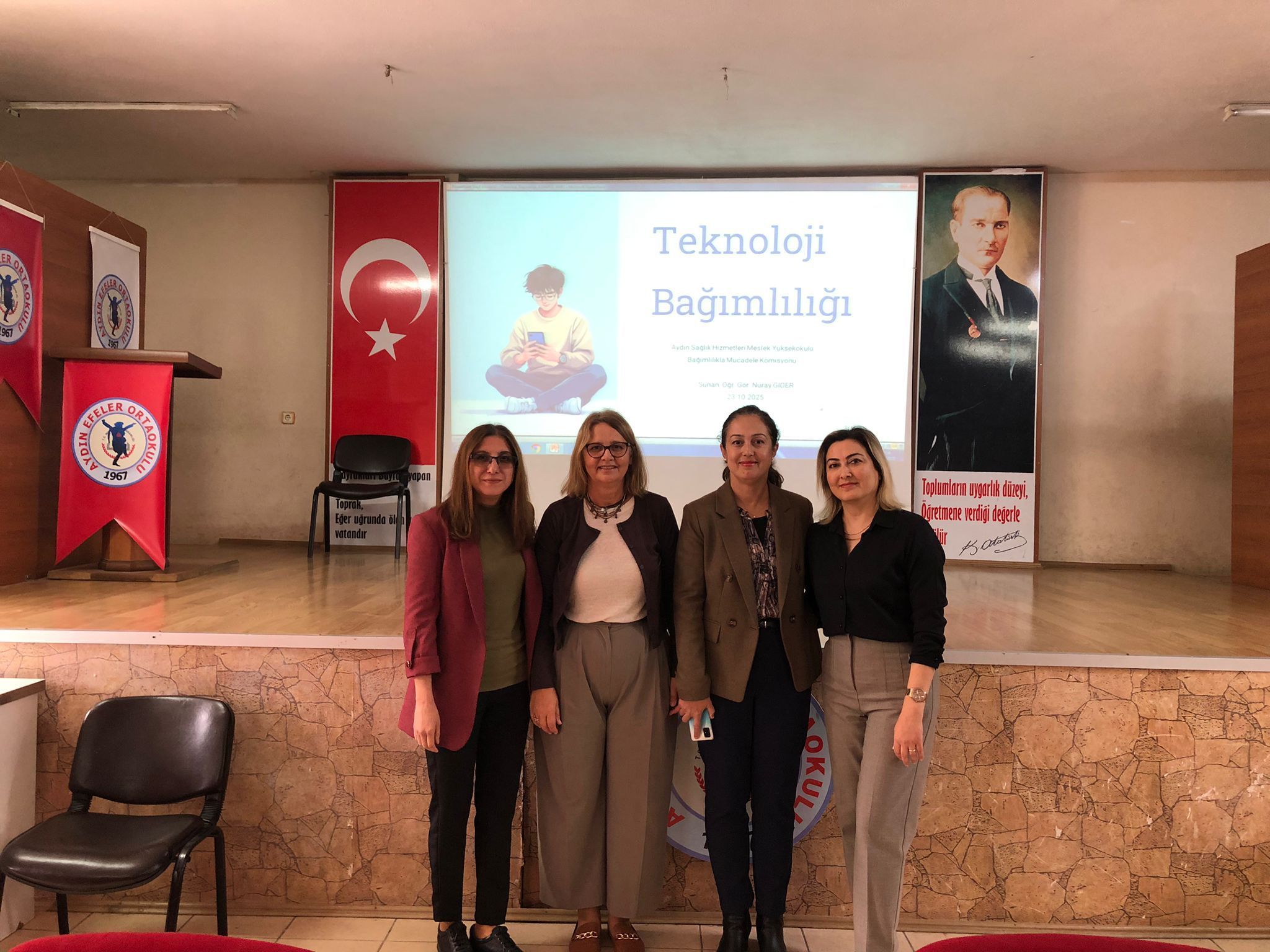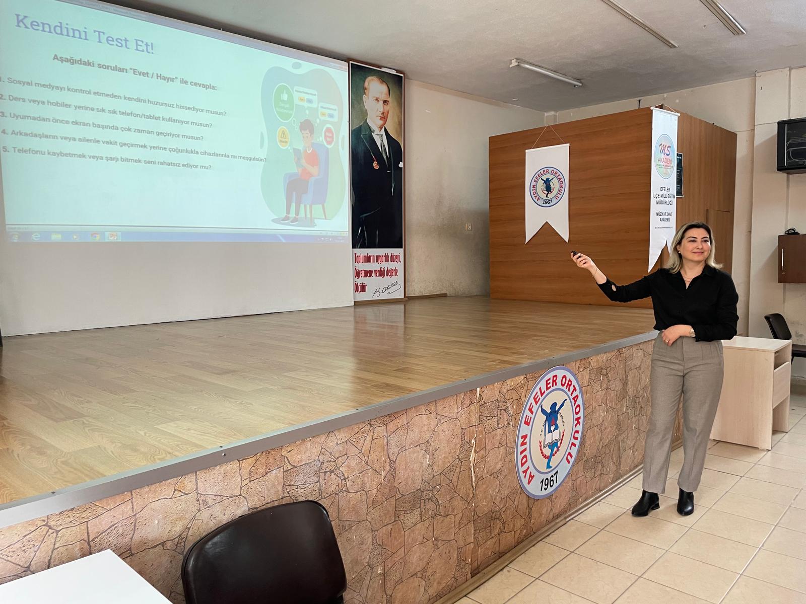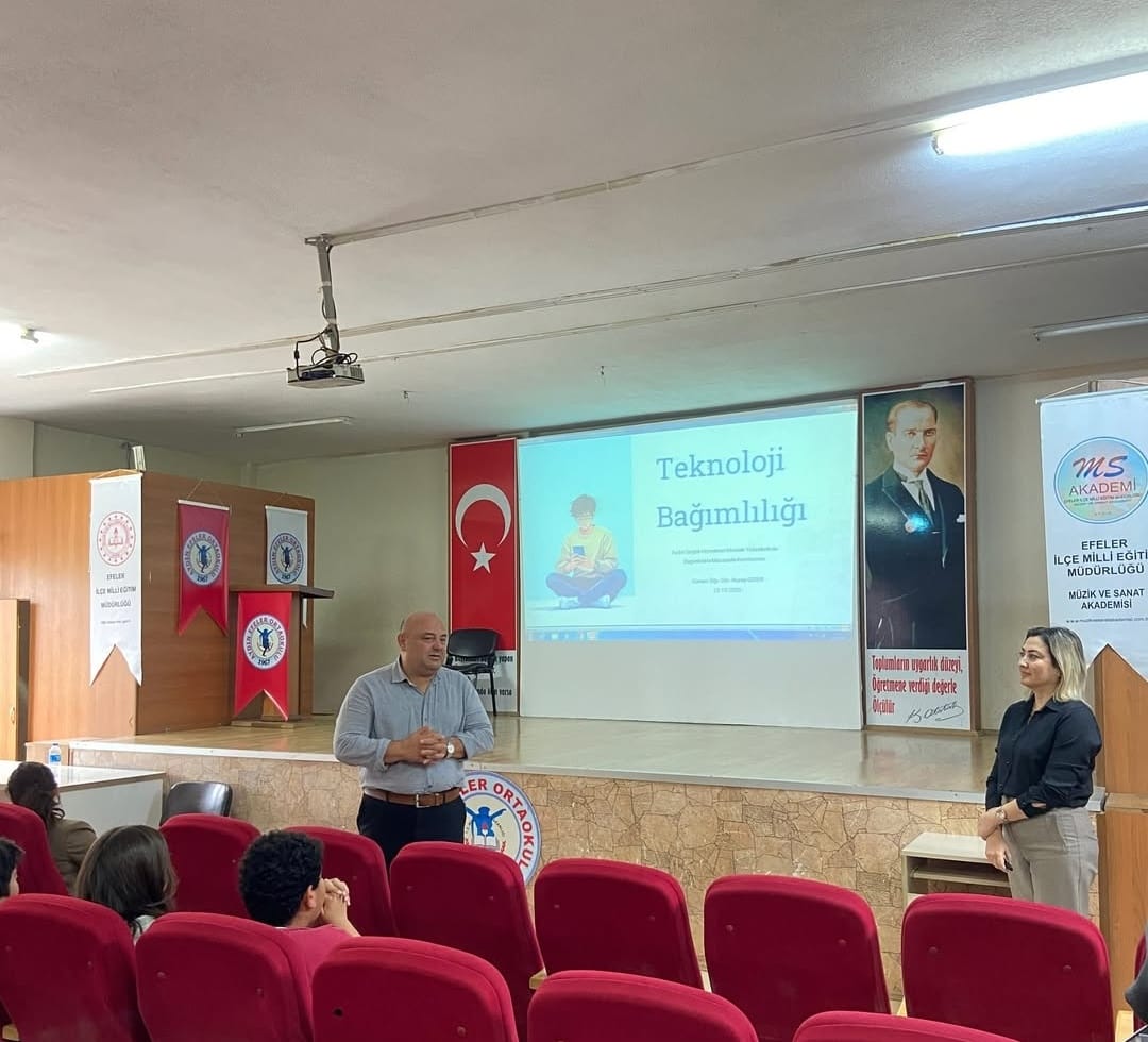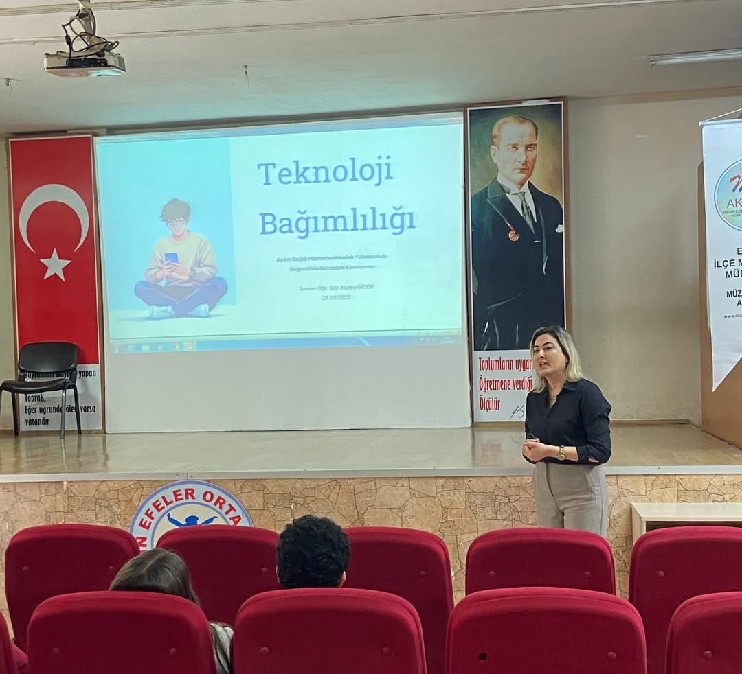 23 Ekim 2025 PerÅŸembe günü Aydın Efeler Ortaokulu 8.sınıf öÄŸrencilerine teknolojinin bilinçli kullanımı, ekran süresi yönetimi ve dijital bağımlılıkta yaÅŸanan saÄŸlık sorunlarına iliÅŸkin teknoloji bağımlılığı konulu seminer ÖÄŸr. Gör. Nuray Gider tarafından gerçekleÅŸtirildi.