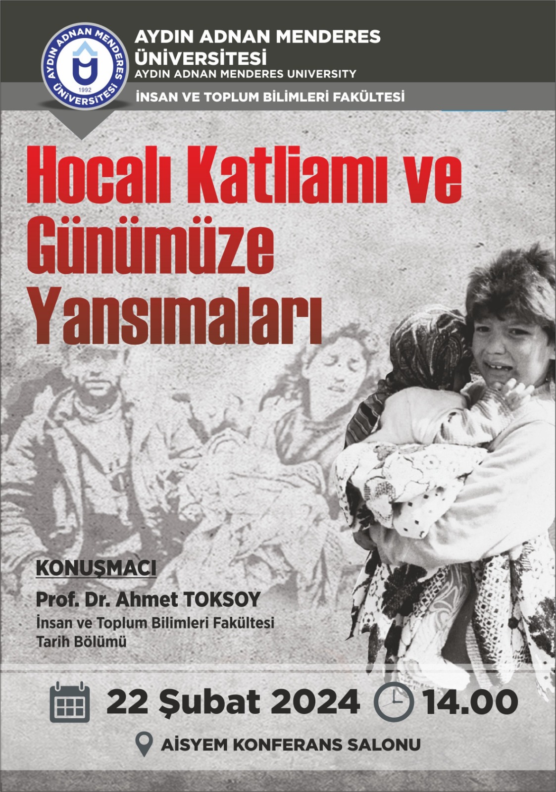 Fakültemiz Tarih Bölümü tarafından 22.02.2024 tarihinde saat 14:00'da Aydın İli Stratejik Planlama ve Yenilik Merkezi (AİSYM) Toplantı Salonu'nda düzenlenecek olan '"Hocalı Katliamı ve Günümüze Yansımaları" adlı konferansta; sizleri aramızda görmekten memnuniyet duyarız