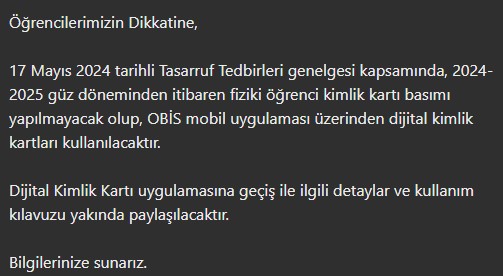 17 Mayıs 2024 tarihli Tasarruf Tedbirleri genelgesi kapsamında, 2024-2025 güz döneminden itibaren fiziki öÄŸrenci kimlik kartı basımı yapılmayacak olup, OBİS mobil uygulaması üzerinden dijital kimlik kartları kullanılacaktır. Dijital Kimlik Kartı uygulamasına geçiÅŸ ile ilgili detaylar ve kullanım kılavuzu yakında paylaşılacaktır. Bilgilerinize sunarız.