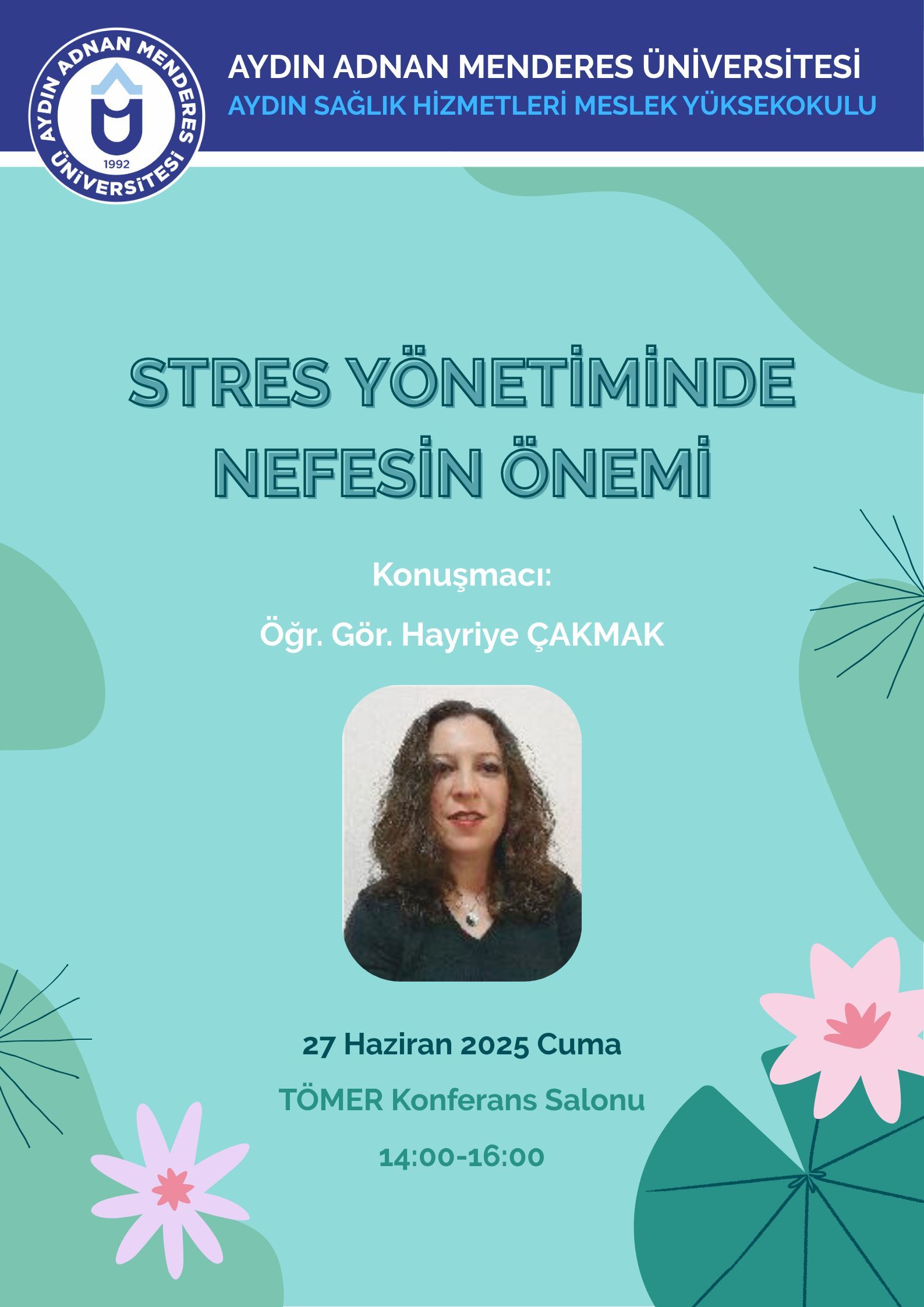 Aydın Adnan Menderes Üniversitesi Aydın SaÄŸlık Hizmetleri Meslek Yüksekokulu tarafından düzenlenecek olan “Stres Yönetiminde Nefesin Önemi” baÅŸlıklı etkinlik, 27 Haziran 2025 Cuma günü saat 14.00–16.00 arasında TÖMER Konferans Salonu’nda gerçekleÅŸtirilecektir.
