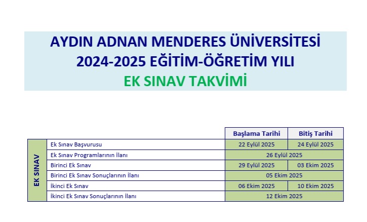 2024-2025 Eğitim-Öğretim Yılı sonunda azami süresini dolduran öğrenciler için ek sınav başvuru ve sınav takvimi aşağıda yer almaktadır. Başvurular, OBİS (Öğrenci Bilgi Sistemi) üzerinden Başvuru İşlemleri >> Ek Sınav Başvuruları menüsünden yapılacaktır.