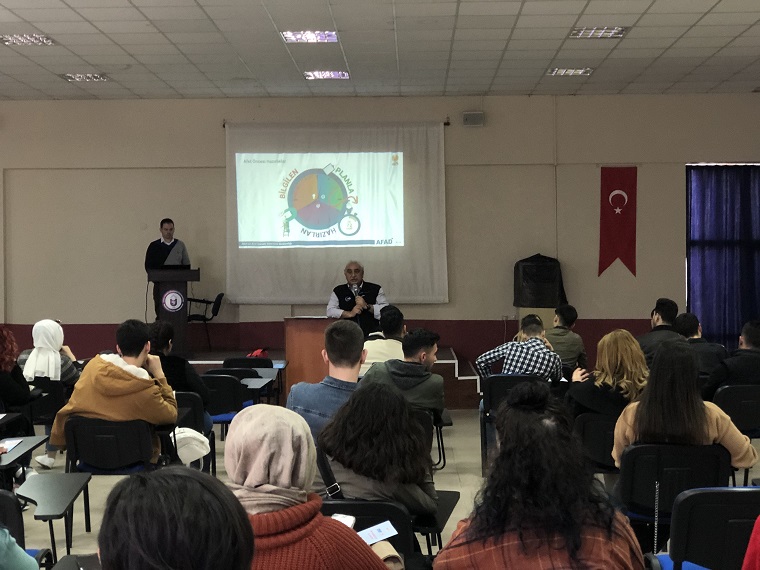 Deprem öncesi alınması gereken tedbirlerin, deprem anında ve sonrasında yapılması gerekenlerin anlatıldığı etkinlikte öÄŸrencilere broÅŸür dağıtılarak arama kurtarma ekipmanları tanıtıldı. EtkinliÄŸe, meslek yüksekokulu akademik personeli ve öÄŸrencileri katıldı.