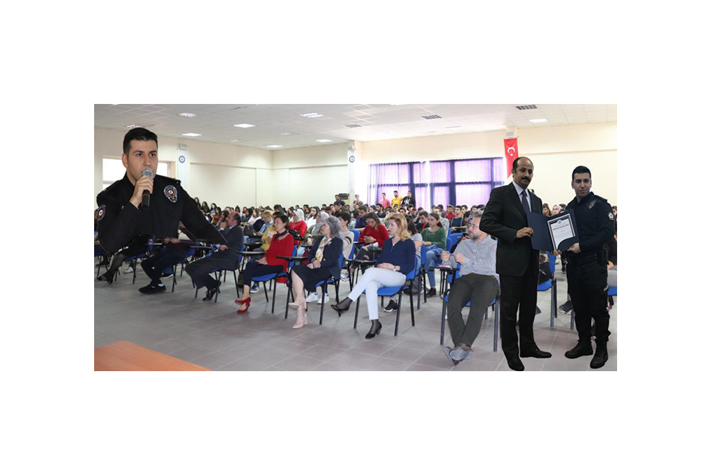 Konferansta Komiser Yardımcısı Yavuz SARI kişilere ve hayata, cinsel dokunulmazlığa, hürriyete, topluma ve genel ahlaka karşı suçlar ve yaptırımları hakkında öğrencileri bilgilendirdi. Üniversitelerin toplumsal sorunların çözümünde önemli bir role sahip olduğu ifade eden SARI, öğrencilere bir vatandaş olarak ödev ve sorumluluklarını hatırlatarak, bilinçli bireyler olarak kendilerini geliştirmelerinin de önemini vurguladı.