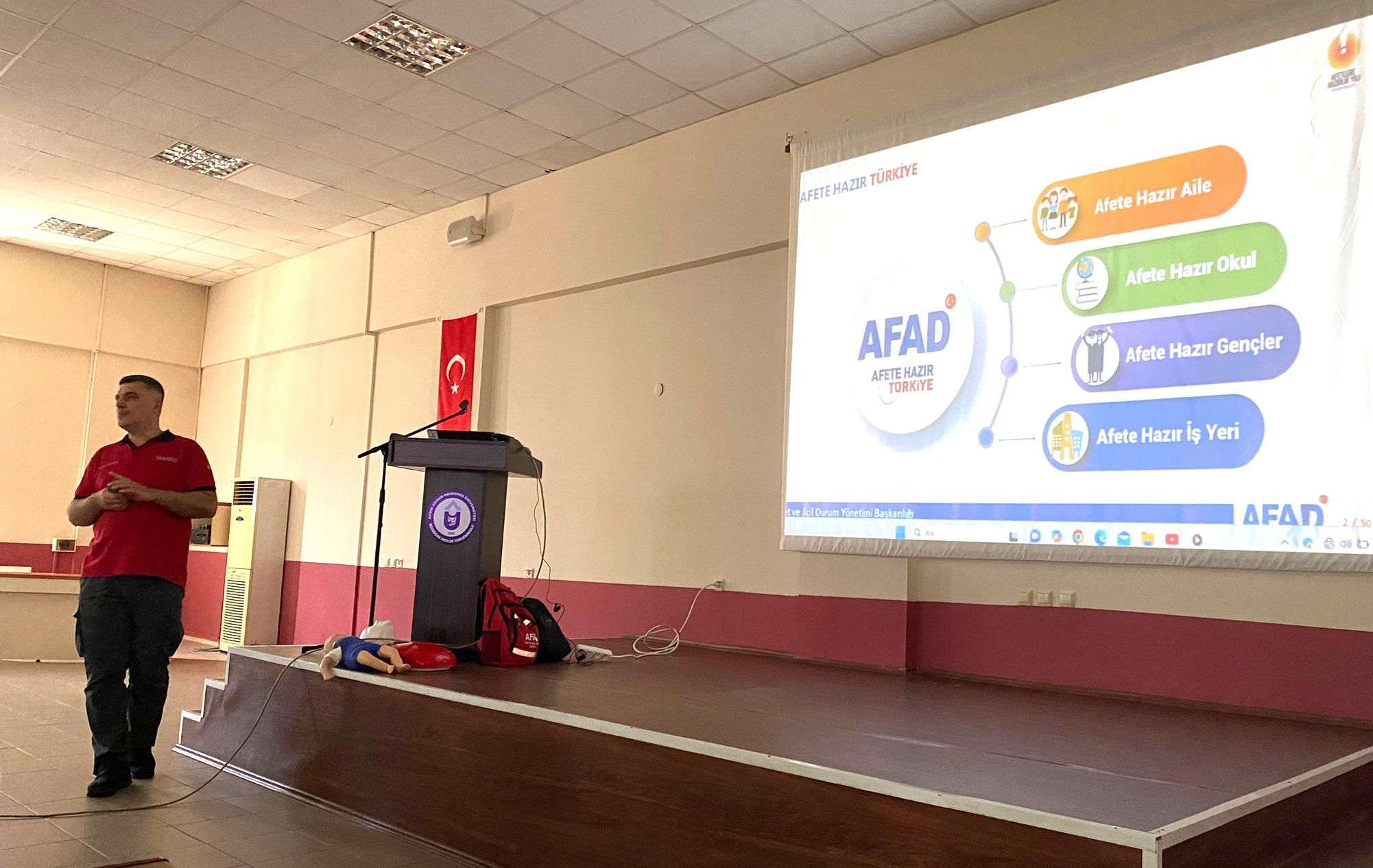 EÄŸitim; İnsan Kaynakları ve EÄŸitim Müdürü Yıldıray TopaloÄŸlu, Afet ve İlk Yardım EÄŸitmeni Uzay Tok, Nazilli Belediyesi Afet ve Acil Durum Ekibi (NAFAD) üyesi Serkan Uzkut tarafından verildi. Programda, afet öncesi planlama, kriz anında doÄŸru karar verme ve acil durumlarda uygulanabilecek ilk yardım müdahaleleri ele alındı.