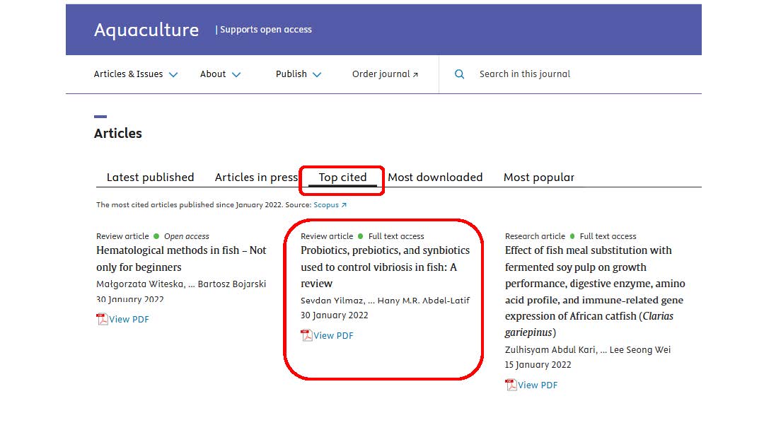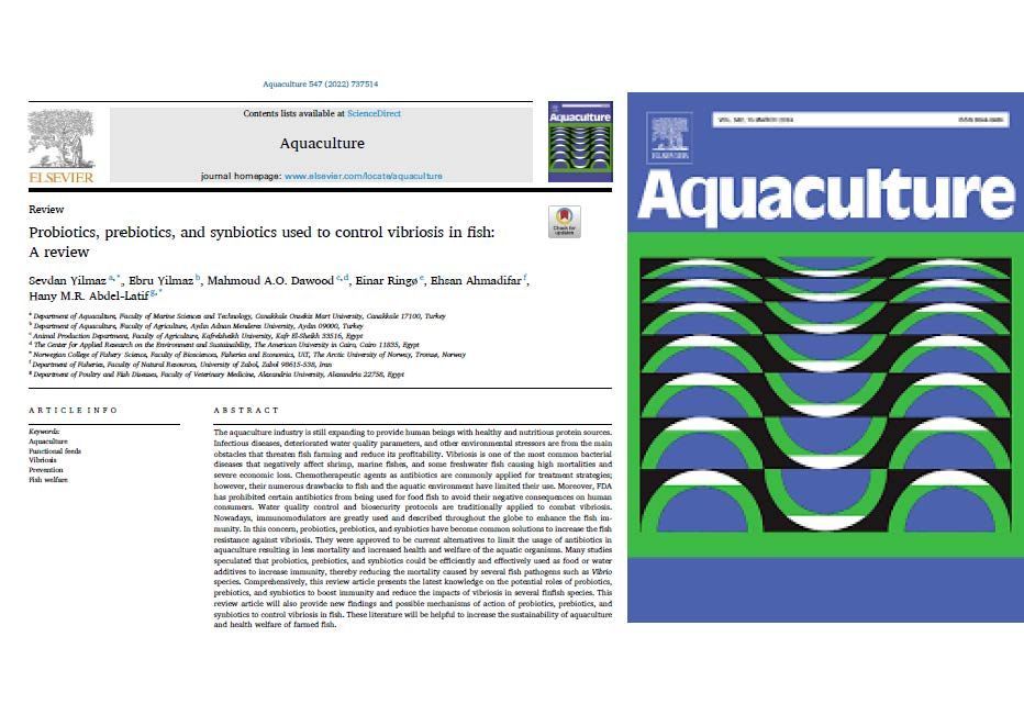 Yüksekokulumuz öÄŸretim üyelerinden Doç. Dr. Ebru Yılmaz’ın yazarları arasında bulunduÄŸu “Probiotics, prebiotics, and synbiotics used to control vibriosis in fish: A review” baÅŸlıklı makale, su ürünleri yetiÅŸtiriciliÄŸi alanında dünyanın önde gelen dergilerinden biri olan Aquaculture dergisinde büyük bir baÅŸarıya imza attı. Ocak 2022 itibarıyla makale, dergide en çok atıf alan ikinci makale olarak dikkat çekti.