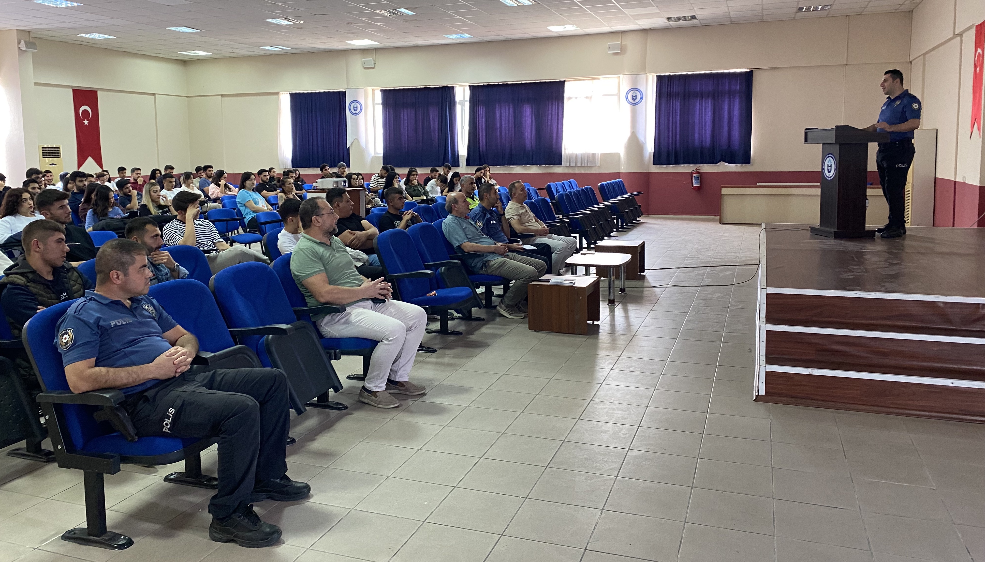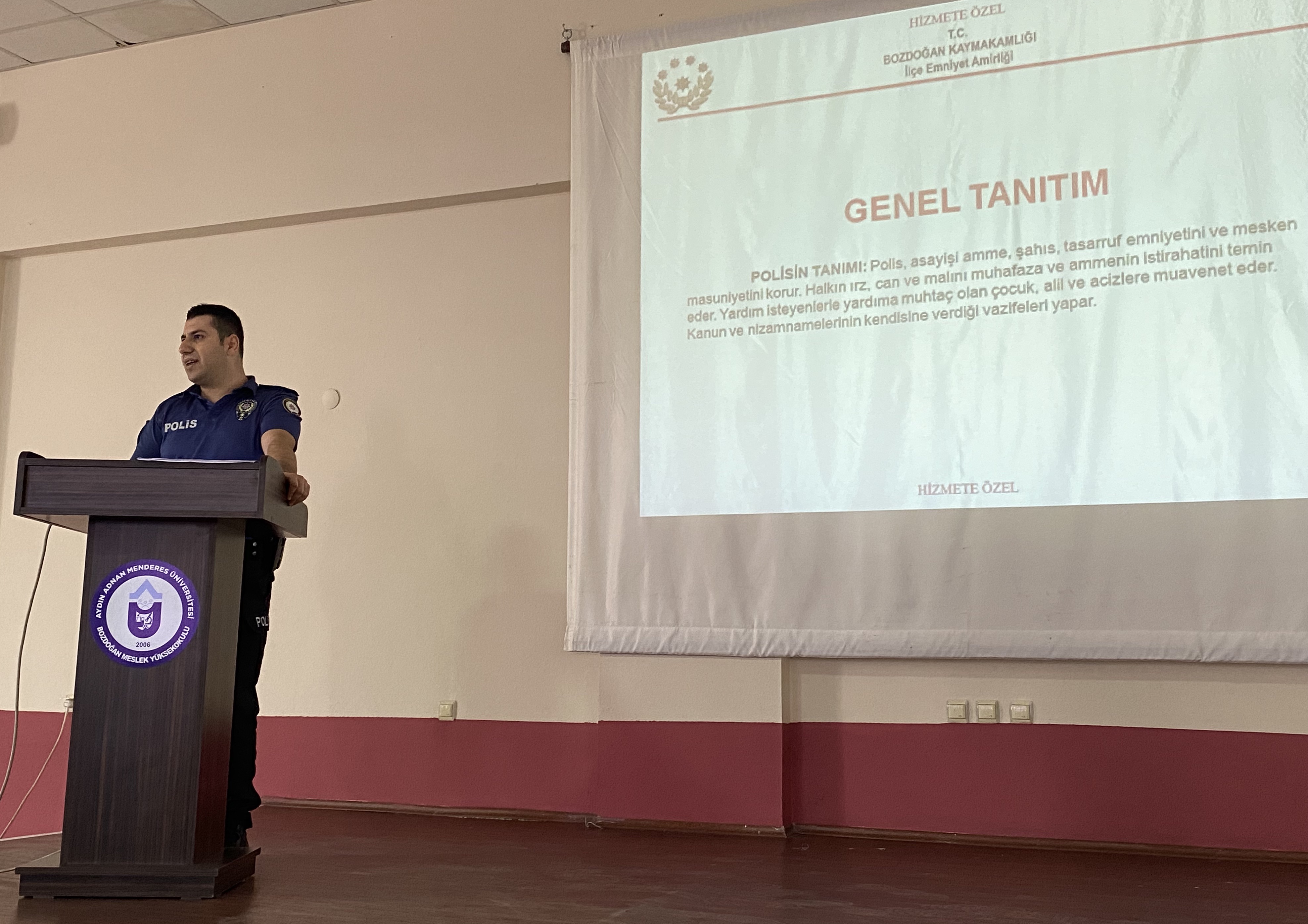 Bozdoğan MYO’ nun konferans salonunda yaklaşık 100 öğrencinin katılımıyla gerçekleştirilen etkinliğe Bozdoğan İlçe Emniyet Amir Vekili Komiser Yavuz Sarı konuşmacı olarak katıldı. Etkinlikte polislerin görevleri, sorumlulukları ve polis olma şartlarını anlatan Komiser Sarı, Türkiye’de adayları polislik mesleğine hazır hale getirmek için ve bu adayların alacağı eğitimlerle polis olmasını sağlamak için Polis Meslek Eğitim Merkezi (POMEM), Polis Meslek Yüksekokulu (PMYO) ve Polis Amirleri Eğitim Merkezi (PAEM) olmak üzere 3 okul bulunduğunu belirtti.