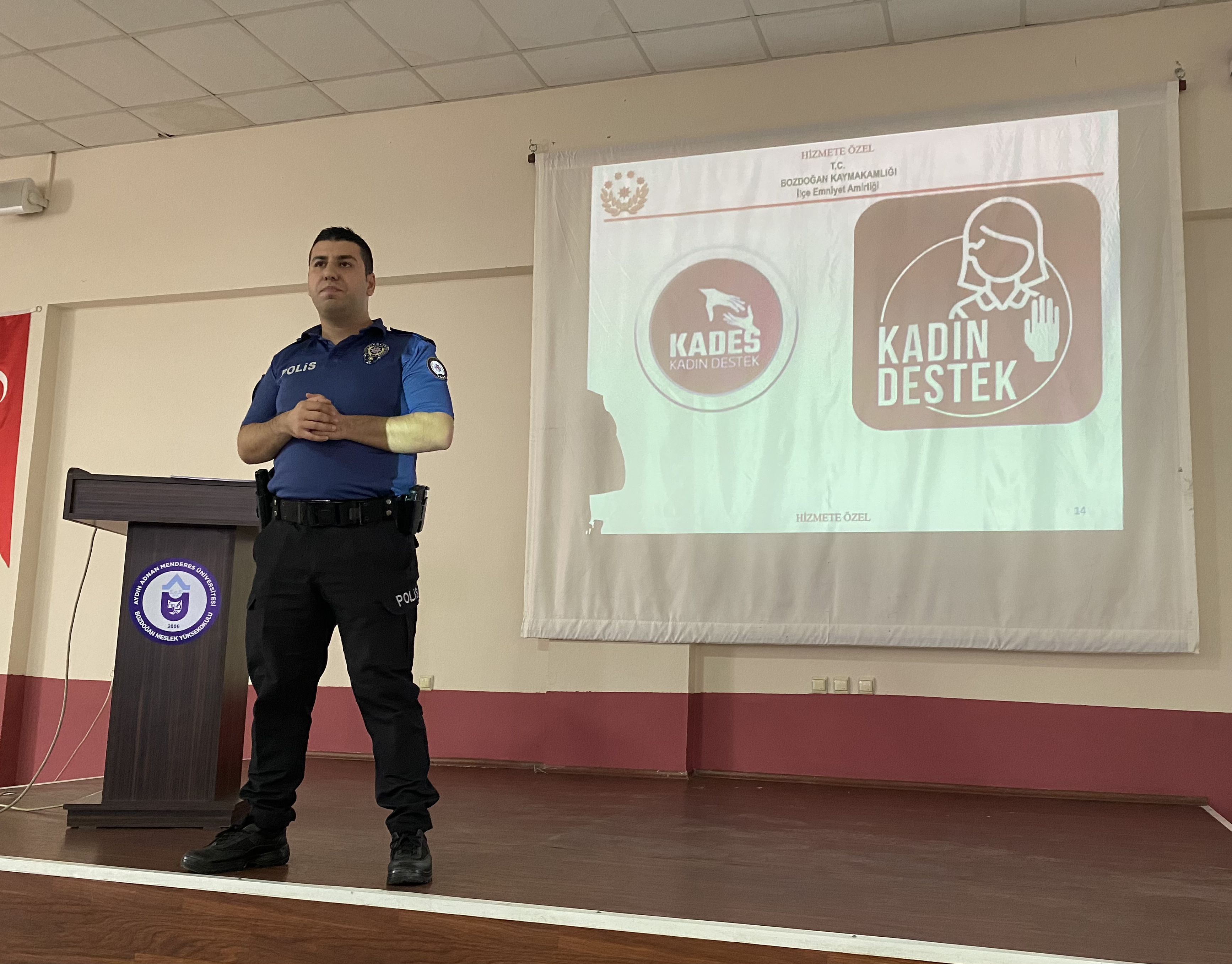 Konferansta Bozdoğan İlçe Emniyet Amirliği tarafından, Bozdoğan MYO öğrencilerine KADES mobil uygulaması ile ilgili broşür dağıtıldı.
