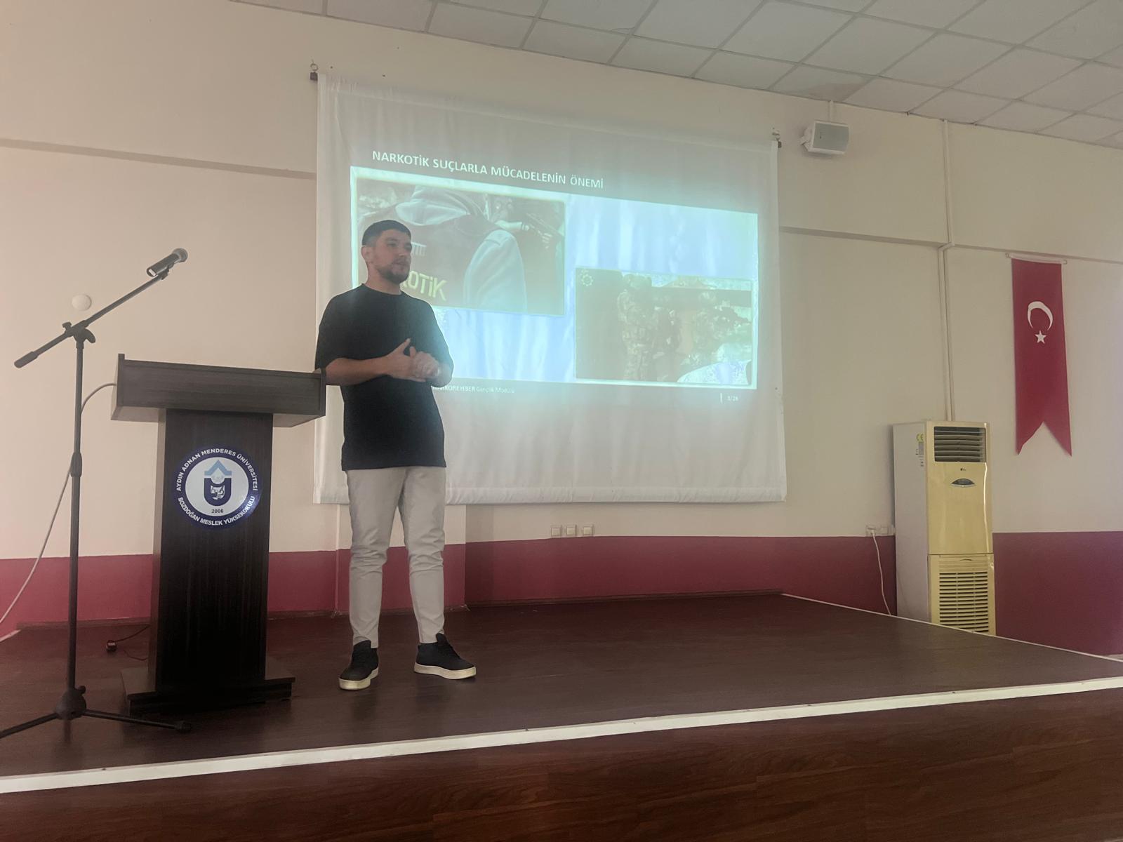 Bozdoğan MYO Konferans Salonu’nda akademik ve idari personel ile öğrencilerin katılımıyla gerçekleştirilen eğitimde Komiser Karadaş, Narkorehber – Gençlik Modülü ile ilgili bilgi verdi. Komiser Karadaş eğitimde, uyuşturucu madde bağımlılığı ve bağımlılık döngüsü ile narkotik suçlarla mücadelenin önemini anlattı.