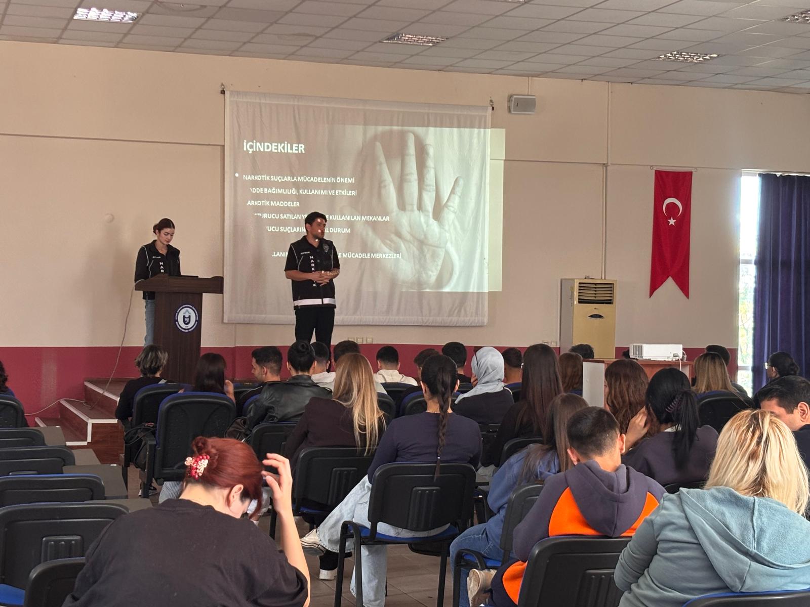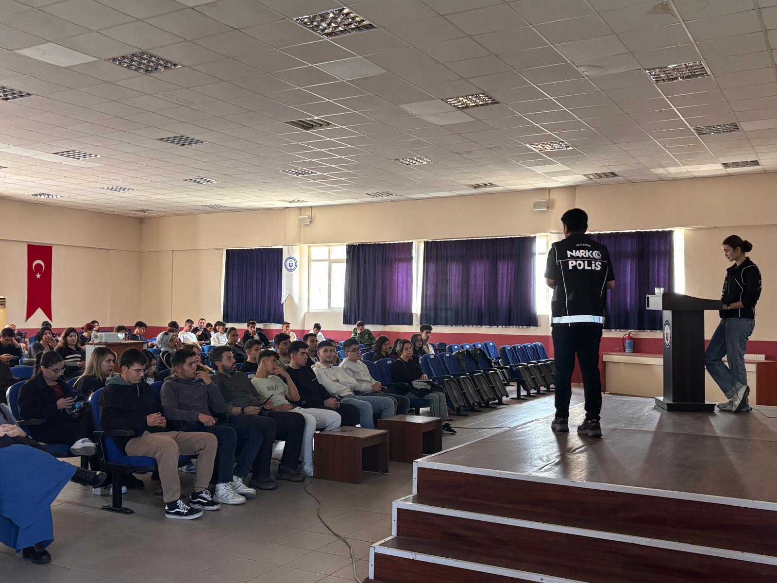 Bozdoğan Meslek Yüksekokulunda, Aydın İl Emniyet Müdürlüğü Nazilli Narkotik Suçlarla Mücadele Büro Amirliğinde görevli Komiser Furkan Karadaş ve Polis Memuru Damla Gürkan tarafından, “NarkoGenç” modülü kapsamında öğrencilere yönelik “Uyuşturucu Madde Bağımlılığıyla Mücadelede Yapılması Gerekenler” konulu farkındalık eğitimi verildi.