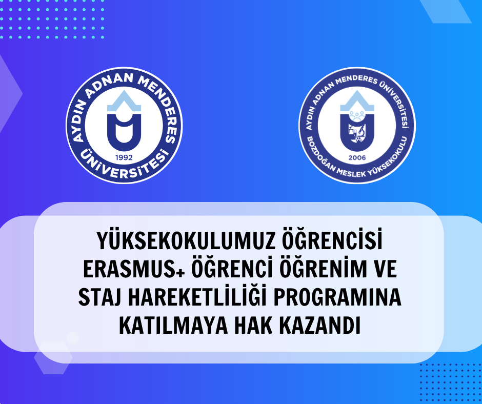 Bozdoğan Meslek Yüksekokulu Veterinerlik Bölümü, Laborant ve Veteriner Sağlık Programı öğrencisi Mina Naz Ersan, Erasmus+ (KA131) Öğrenci Öğrenim ve Staj Hareketliliği Programı kapsamında asil olarak seçilmeye hak kazandı.