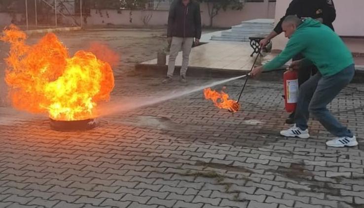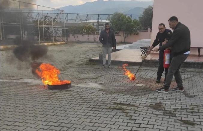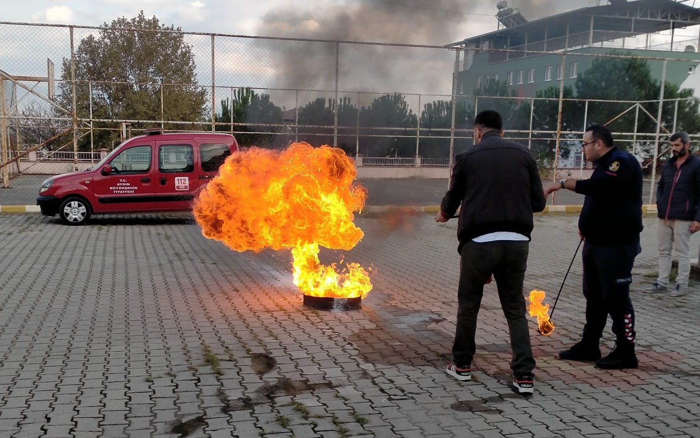 EÄŸitimin ardından yüksekokulun bahçesinde gerçekleÅŸtirilen yangın söndürme tatbikatında, katılımcılar uygulamalı olarak yangın söndürme tekniklerini deneyimleme fırsatı buldu.