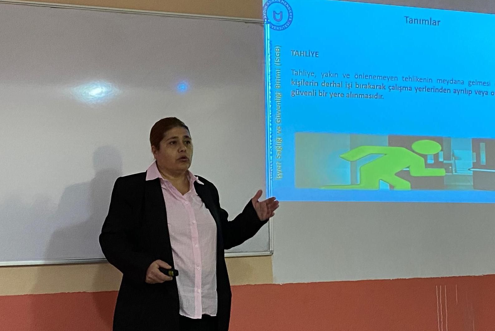 EÄŸitimde, İş GüvenliÄŸi Uzmanı Gülay Kandemir “Acil Durum Planı, Güvenli Yer (Toplanma Yeri), Tahliye, Kurtarma”; Yangın ve Yüksekte Çalışma EÄŸitmeni Tayfun Küçükçal “Bireyler İçin Temel Yanma ve Yangın Bilgisi” konularında bilgi verdi.
