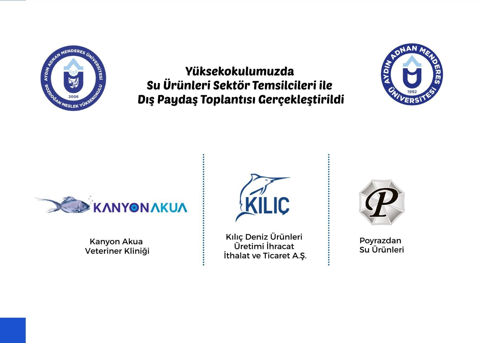 Bozdoğan Meslek Yüksekokulu (MYO) Veterinerlik Bölümü Laborant ve Veteriner Sağlık Programı kapsamında, eğitim–öğretim faaliyetlerinin güncel su ürünleri sektörü gereksinimleriyle uyumlu şekilde geliştirilmesi ve iş dünyası–akademi iş birliğinin güçlendirilmesine yönelik Dış Paydaş Toplantısı, 25 Kasım 2025 tarihinde çevrim içi olarak gerçekleştirildi. Toplantıya sektör temsilcileri ile yüksekokulun akademik personeli katıldı.