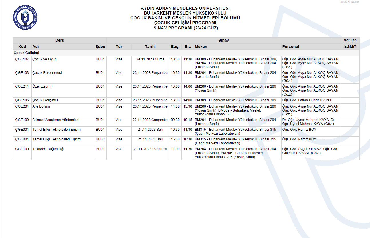 ÇOCUK GELİŞİMİ PROGRAMI ARA SINAV PROGRAMI
