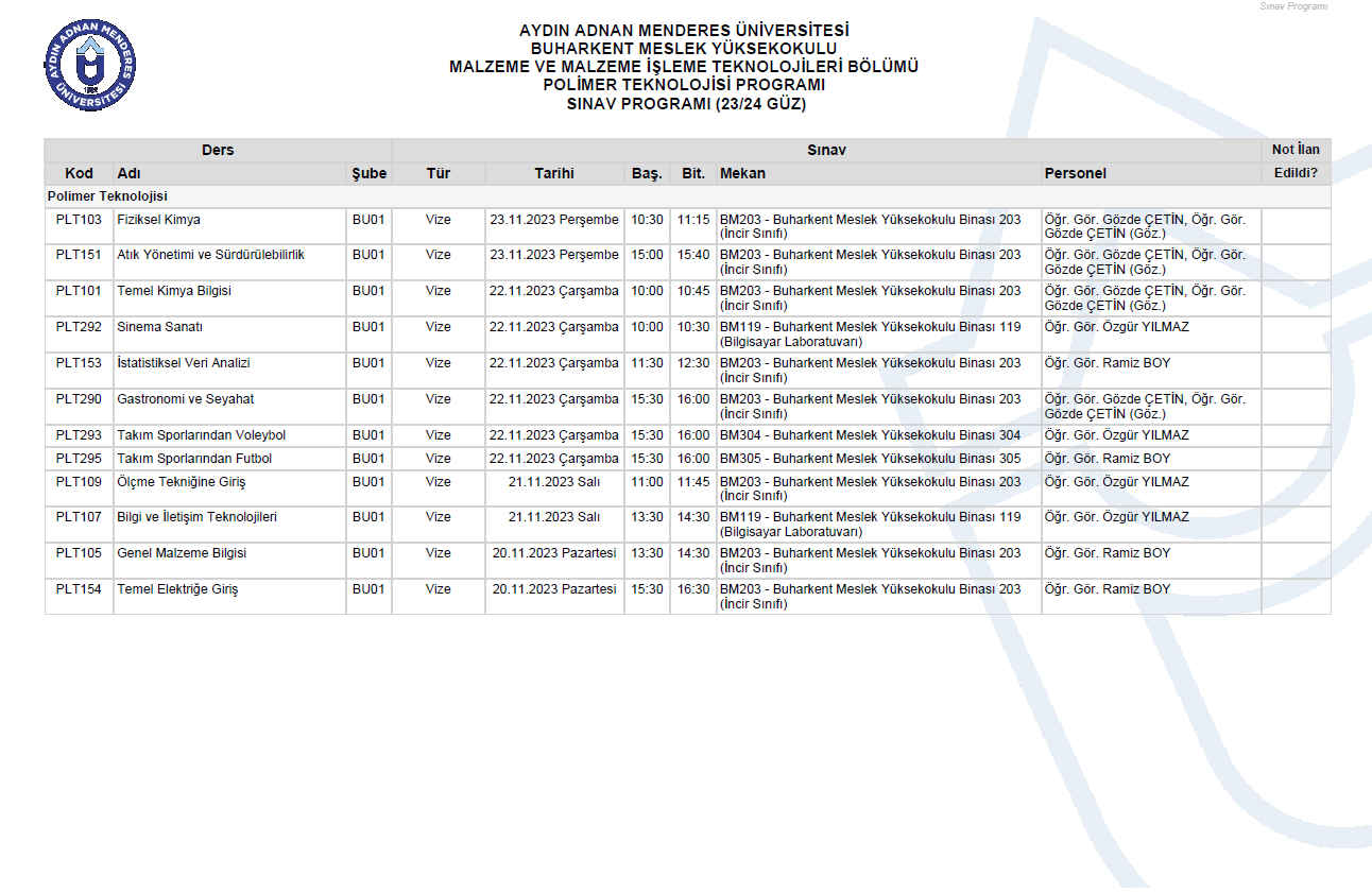 POLİMER TEKNOLOJİSİ PROGRAMI ARA SINAV PROGRAMI