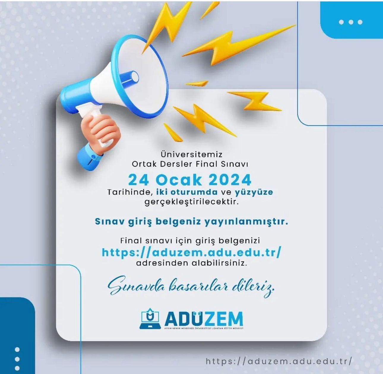 Final sınavı için giriş belgenizi https://aduzem.adu.edu.tr/ adresinden alabilirsiniz.