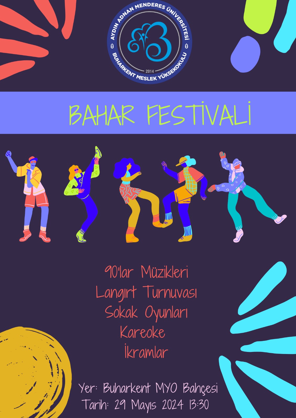 "BUHARKENT MYO'DA BAHAR FESTİVALİ"29.05.2024 tarihinde Buharkent Meslek Yüksekokulunda Bahar Festivali düzenlendi. Etkinliğe okulumuz akademik ve idari personel ile öğrencilerimiz katılım sağladı. Öğr. Gör. Özgür YILMAZ ve Öğr. Gör. İsmet ANIK BAYSAL’ın öncülüğünde hazırlanan festivalde 90’lar müzikleri eşliğinde halat çekme, çuval yarışı, yumurta taşıma, sandalye kapmaca, langırt turnuvası ve kareoke yarışmaları düzenlendi. Çocuk Gelişimi Programı öğrencilerinin hazırladığı 90'lar afişi festivale renk kattı. Oldukça eğlenceli geçen etkinlik sonrası öğrencilerin ve hocaların birlikte bahçede çöp toplaması ile çevre bilinci de vurgu yapıldı.
