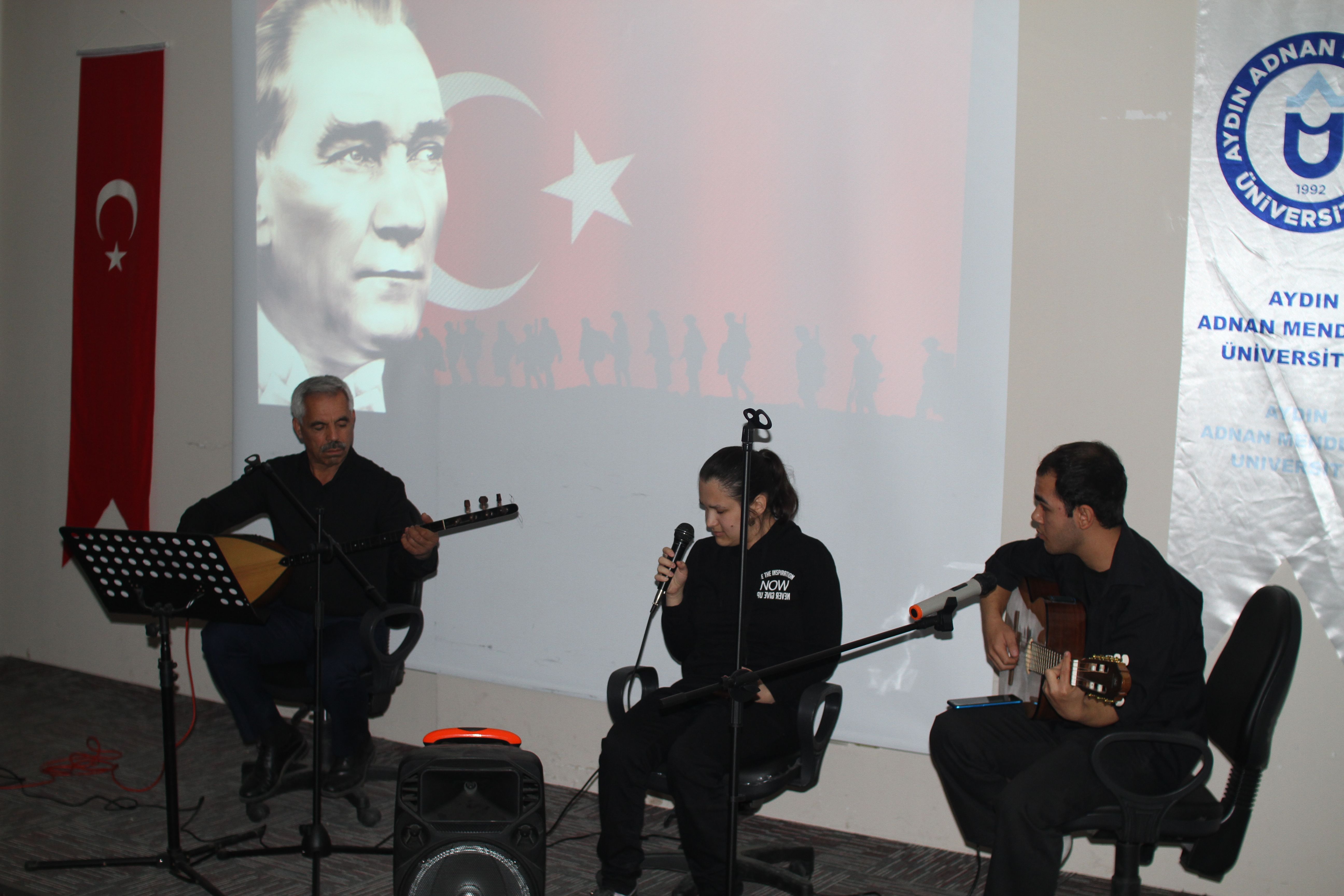 "CUMHURİYETİMİZİN 101. YILI MÜZİK DİNLETİSİ"06.11.2024 Çarşamba Günü okulumuz Mehmet PARMAKSIZOĞLU Konferans Salonunda Cumhuriyetimizin 101. Yılı Etkinlikleri kapsamında Müzik Dinletisi yapılmıştır. Meslek Yüksekokulumuz öğrencilerinden Edanur KARABULUT ile Sabri TURUNÇ ve Buharkent Esnaflarından Feridun BAŞARAN tarafından Mustafa Kemal ATATÜRK'ÜN sevdiği şarkılar seslendirilmişdir.