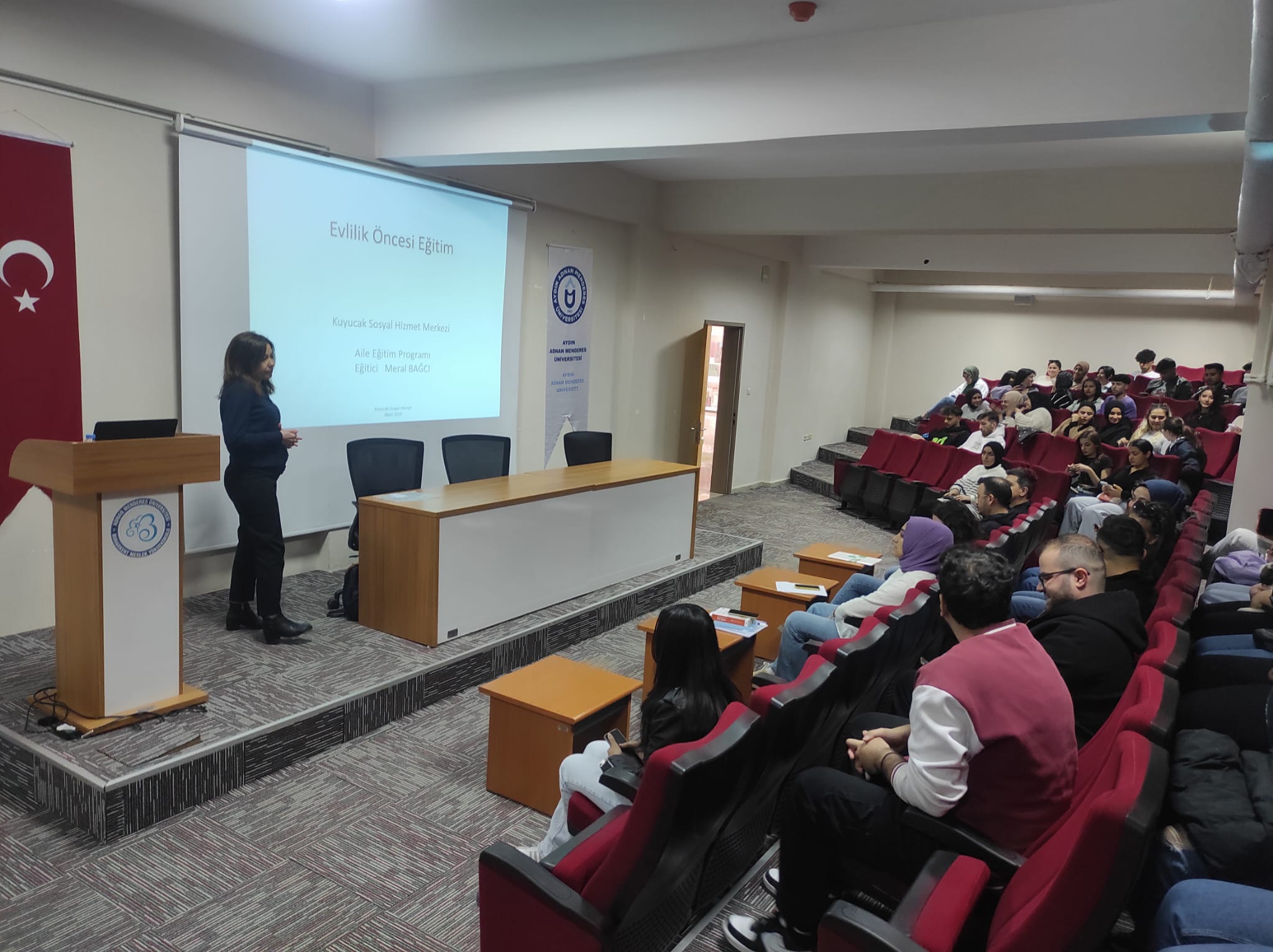 Buharkent Meslek Yüksekokulu Mehmet PARMAKSIZOĞLU Konferans Salonunda 21.03.2024 Perşembe günü Kuyucak Sosyal Hizmetler Merkezi Müdürlüğünden Meral BAĞCI tarafından öğrencilerimize “Evlilik Öncesi Eğitim” verildi.