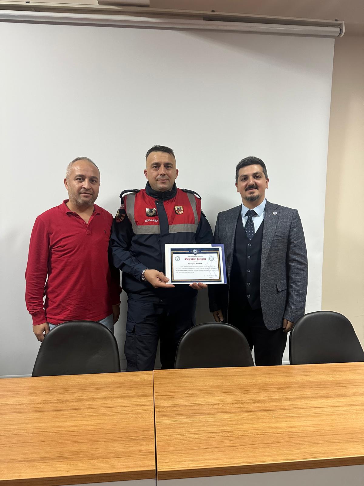 Program sonunda Buharkent Meslek Yüksekokulu Müdür Yardımcıları Öğr. Gör. Yasin BAŞLAR ve Öğr. Gör. Gültekin BAYSAL, Jandarma Astsubay Kıdemli Üstçavuş Çetin KAYNAK’a teşekkür belgesi takdim ederek meslek hayatında başarılar diledi.