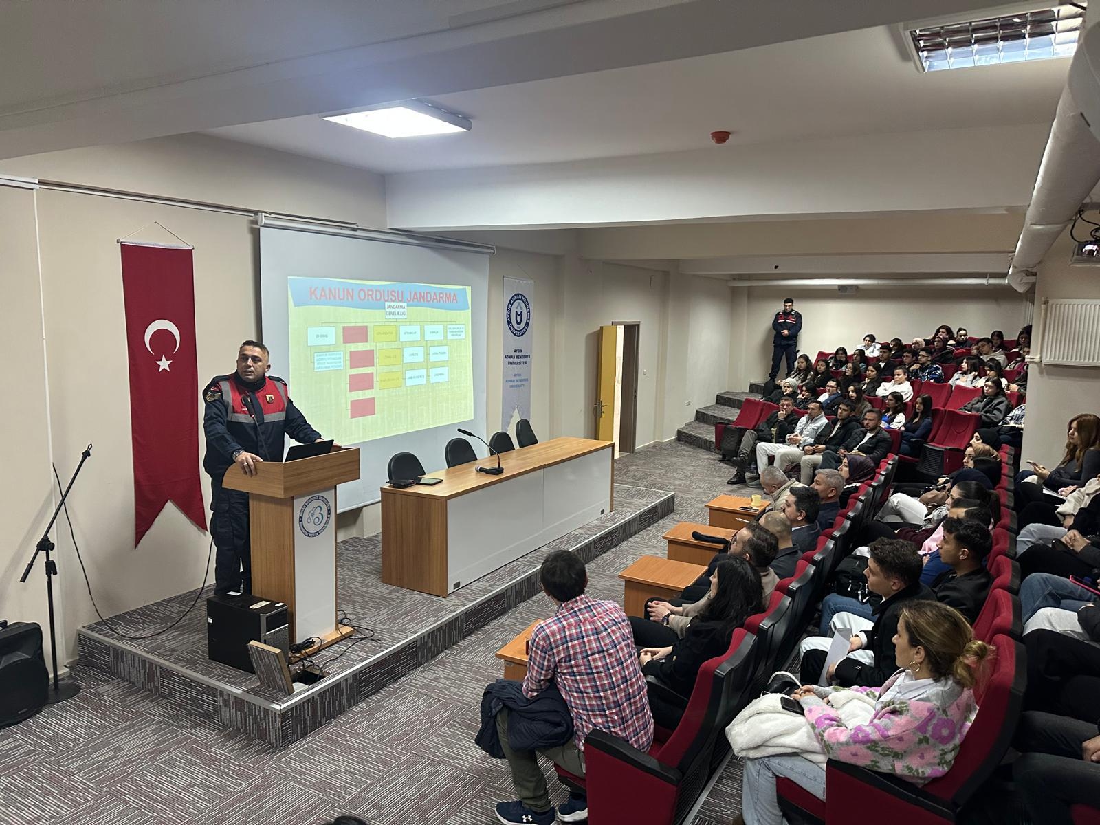 Aydın Adnan Menderes Üniversitesi Buharkent Meslek Yüksekokulu’nda, 24 Aralık Çarşamba günü, öğrencilerin mesleki farkındalıklarını artırmaya yönelik bir program düzenlendi. Program kapsamında Jandarma Astsubay Kıdemli Üstçavuş Çetin KAYNAK, öğrencilere mesleki kariyer planlaması ile Jandarma Teşkilatı’nın görev, yetki ve çalışma alanlarına ilişkin kapsamlı bir sunum gerçekleştirdi.