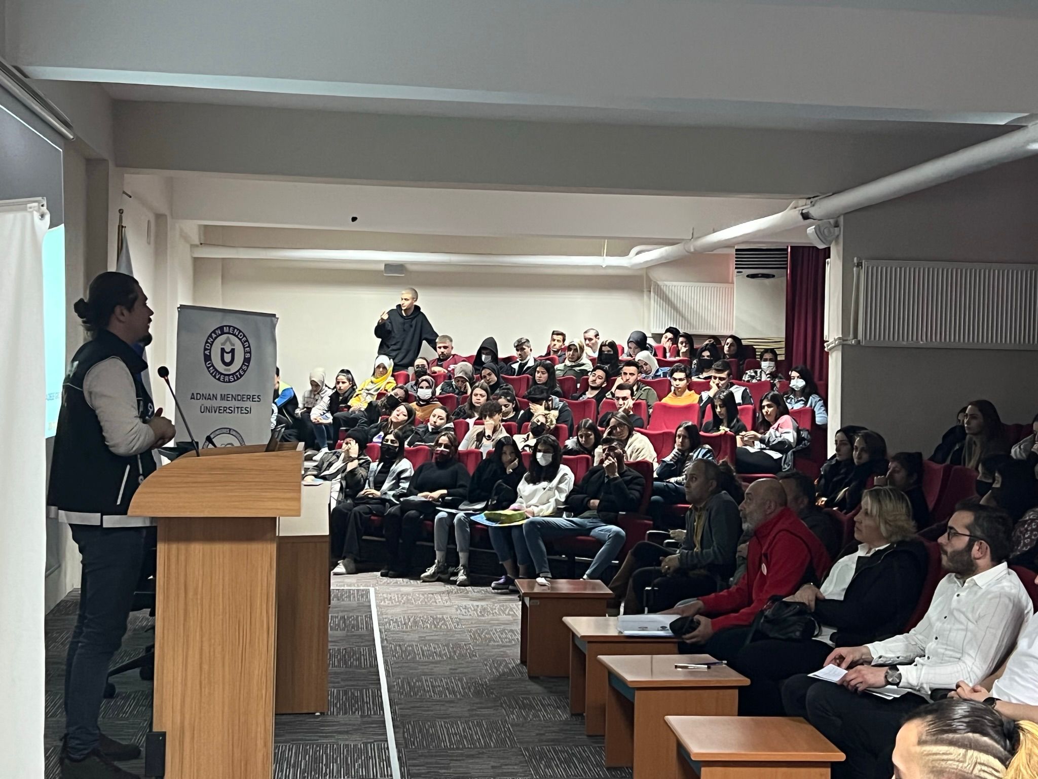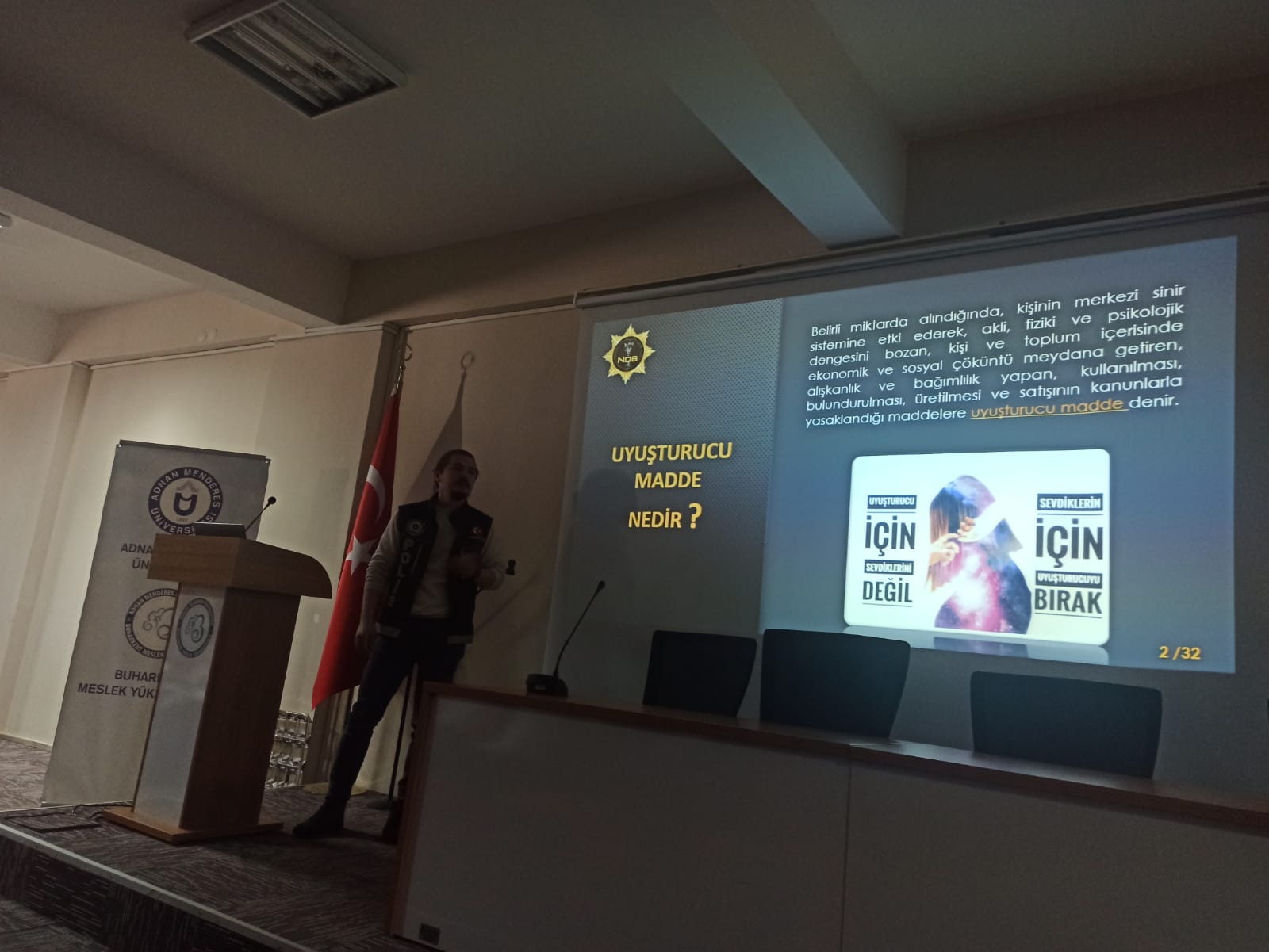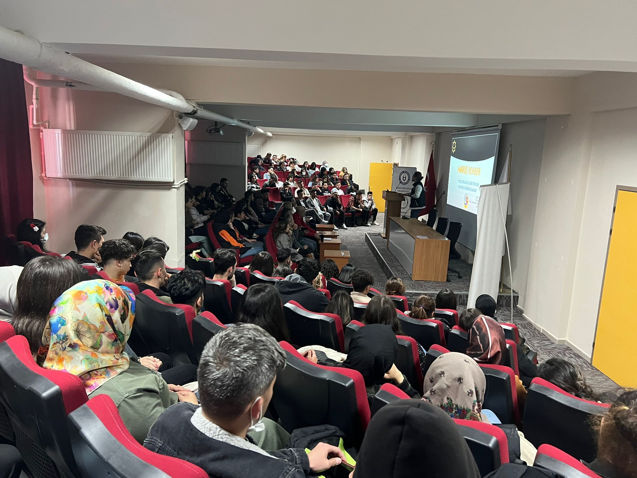 Seminer kapsamında Nazilli İlçe Emniyet yetkilileri tarafından öğrencilere yönelik madde bağımlılığı ve bu tarz kötü alışkanlıklardan korunma yöntemleri konusunda sunum yapılmıştır.