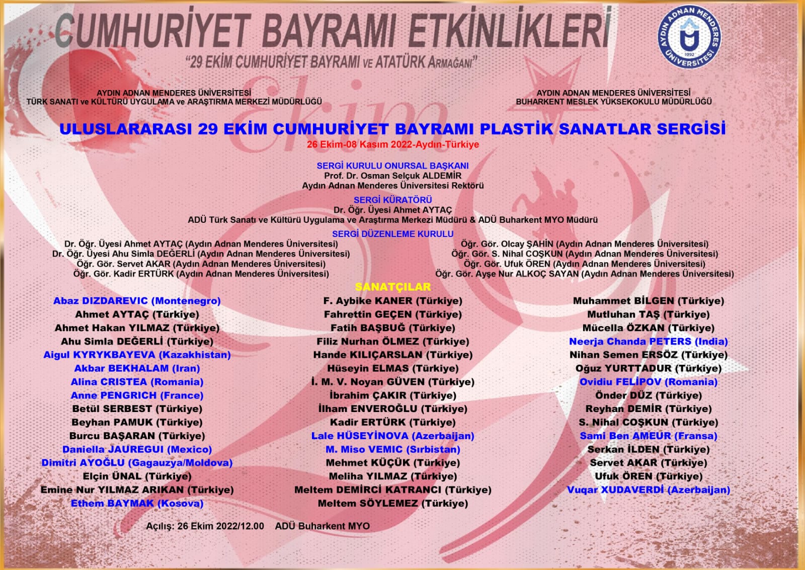 Cumhuriyetimizin 99. yılı münasebetiyle ADÜ Türk Sanatı ve Kültürü Uygulama ve Araştırma Merkezi Müdürlüğü ile ADÜ Buharkent MYO iş birliği kapsamında ULUSLARARASI 29 EKİM CUMHURİYET BAYRAMI PLASTİK SANATLAR SERGİSİ 26 Ekim Çarşamba günü açıldı. Buharkent MYO'da açılışı yapılan sergiye Buharkent Kaymakamı Sayın Alper AÇIKGÖZ, Buharkent MYO Müdürü Dr. Öğretim Üyesi Ahmet AYTAÇ, mülki idare amirleri, üniversitemizin akademik ve idari personeli ile üniversitemizin öğrencileri katıldı.