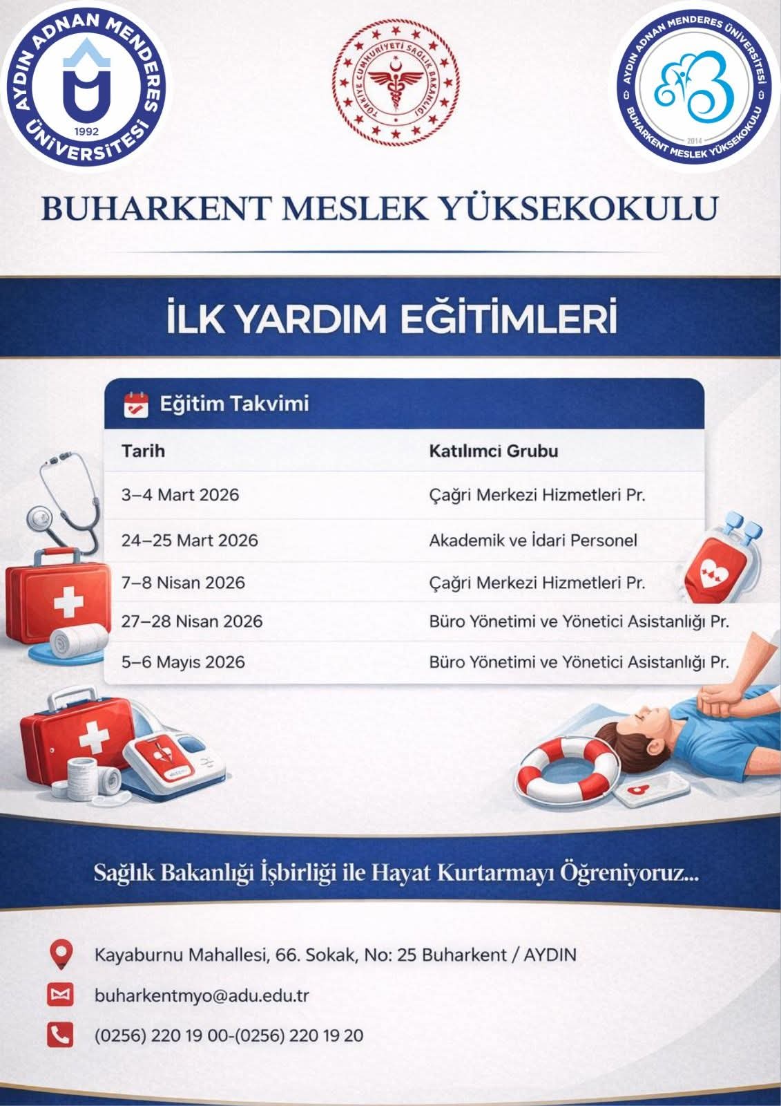 BUHARKENT MYO’DA HAYAT KURTARAN İŞ BİRLİĞİ: İLK YARDIM EĞİTİMLERİ BAŞLADIAydın Adnan Menderes Üniversitesi (ADÜ) Buharkent Meslek Yüksekokulu, Sağlık Bakanlığı ile iş birliği içerisinde anlamlı bir eğitim seferberliği başlattı. "Hayat Kurtarmayı Öğreniyoruz..." sloganıyla düzenlenen eğitim programı kapsamında, öğrencilere ve üniversite personeline hayati önem taşıyan ilk yardım müdahaleleri uygulamalı olarak aktarılıyor.