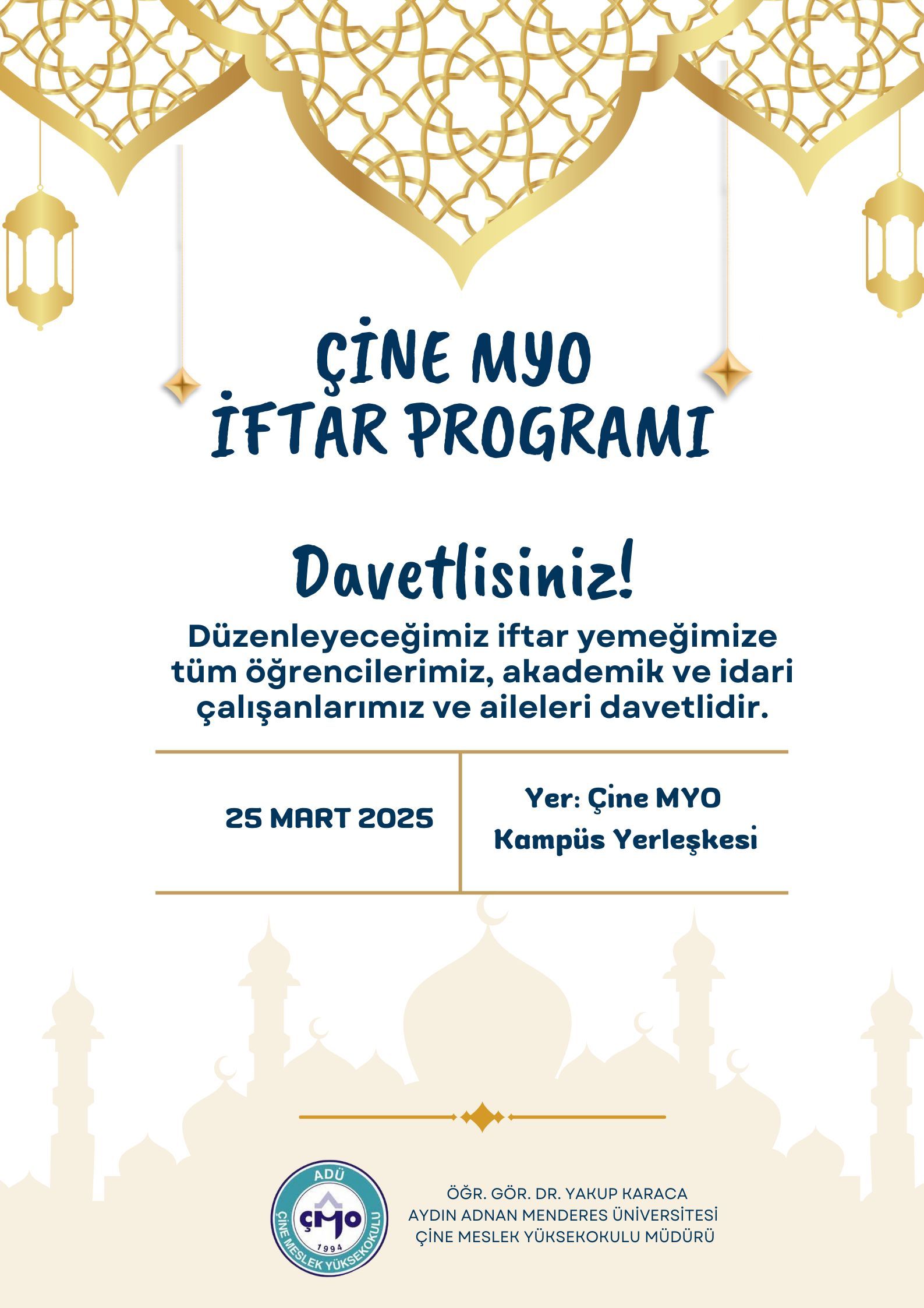 Meslek yüksekokulumuzda 25 Mart Salı günü iftar programı gerekleştirilecektir. Tüm öğrencilerimiz, akademik ve idari personelimiz ile aileleri davetlidir.