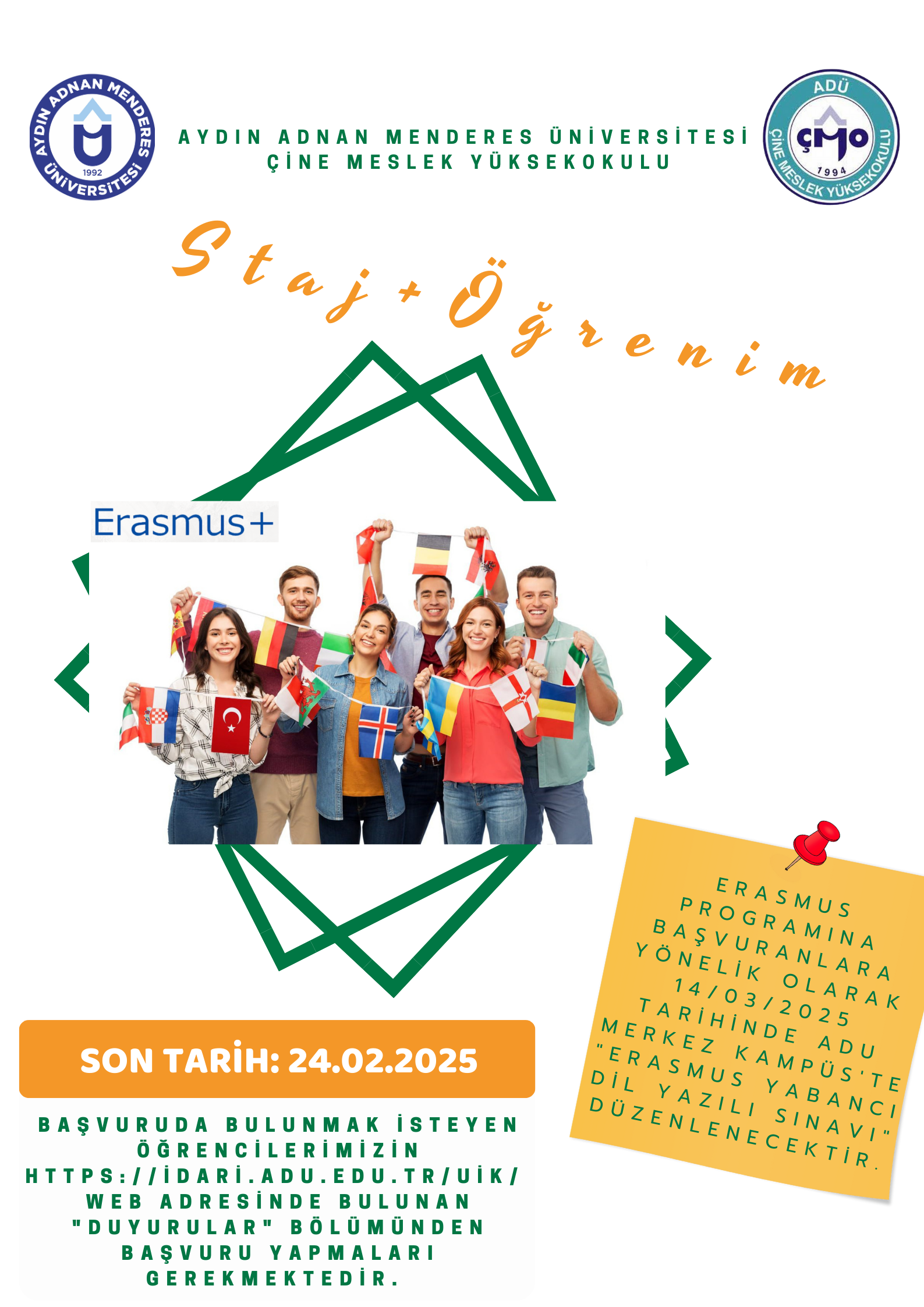 Not: Erasmus Programına başvuranlara yönelik olarak 14/03/2025 tarihinde ADU Merkez Kampüs'te "Erasmus Yabancı Dil Yazılı Sınavı" düzenlenecektir.