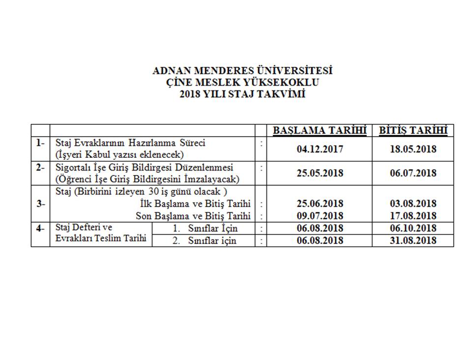 2018 YILI STAJ TAKVİMİ