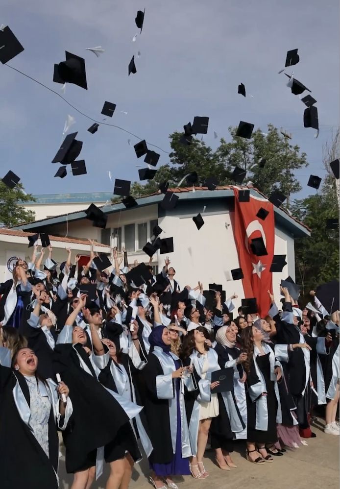 Mezuniyet belgelerinin takdim edilmesinin ardından öÄŸrenciler hep birlikte keplerini havaya fırlatarak bu özel günü coÅŸku içinde kutladı.
