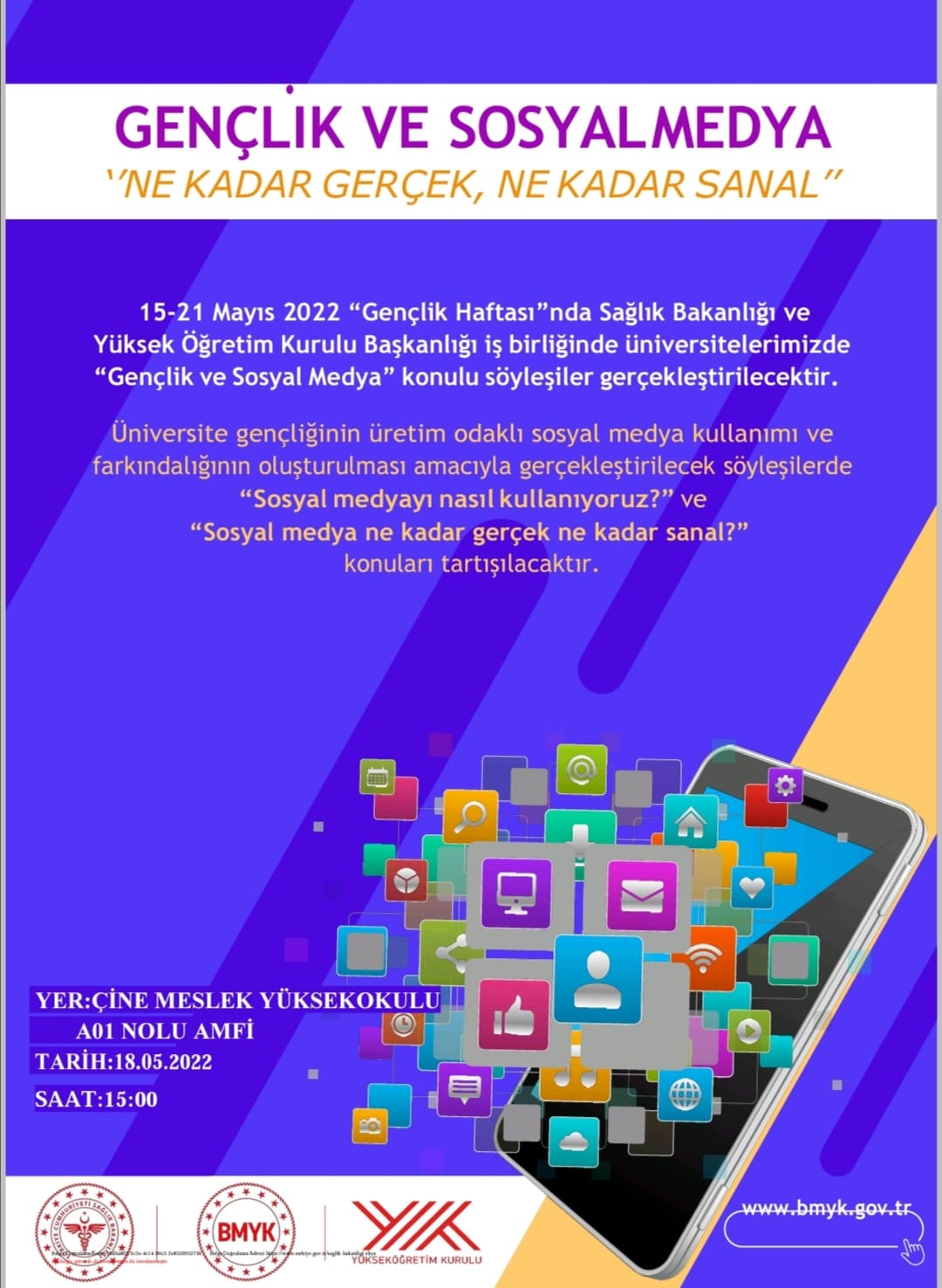 SaÄŸlık Bakanlığı ve Yüksek ÖÄŸretim Kurulu BaÅŸkanlığı iÅŸ birliÄŸinde Yüksekoklulmuzda 18 Mayıs 2022 tarihinde saat 15.00'da A01 Nolu Anfi' de “Gençlik ve Sosyal Medya” konulu söyleÅŸi gerçekleÅŸtirilecektir.