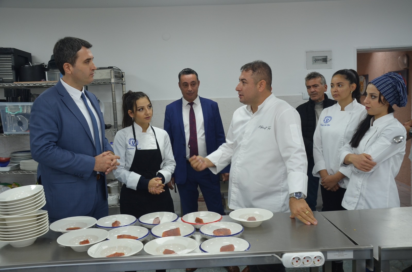 Ziyarette, AÅŸçılık programı öÄŸrencileri tarafından hazırlanan yemekler Kaymakam Kuruca ve basın mensuplarına ikram edildi.