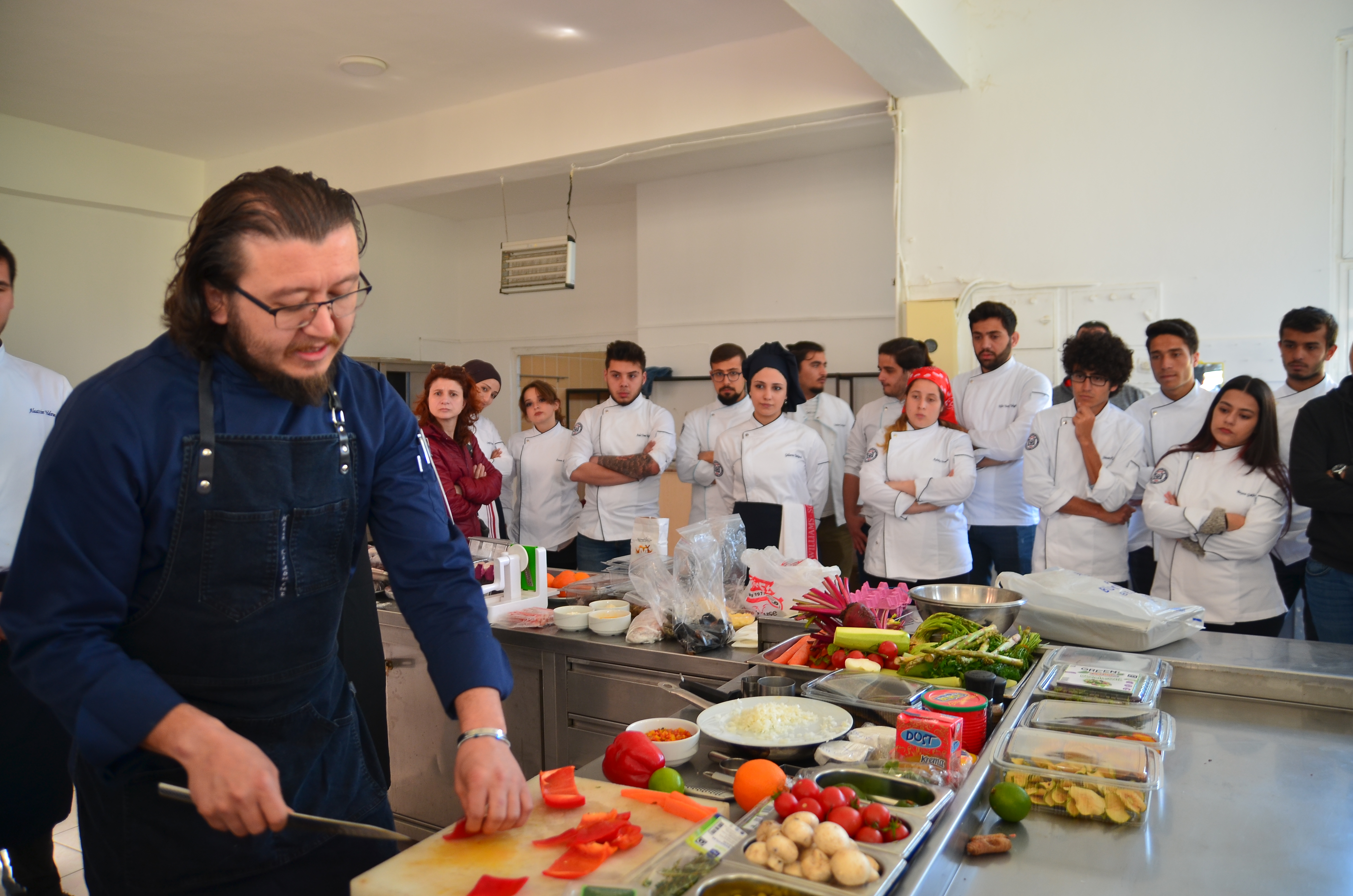 ÖÄŸrencilerimiz ve AÅŸçılık programı ÖÄŸr. Gör. Okan Umut ÅžimÅŸek ile uygulama mutfağında bir araya gelen Chef Hasan Ali Karabulut, tecrübelerini öÄŸrencilerle paylaÅŸarak birbirinden güzel tabaklar hazırladı.