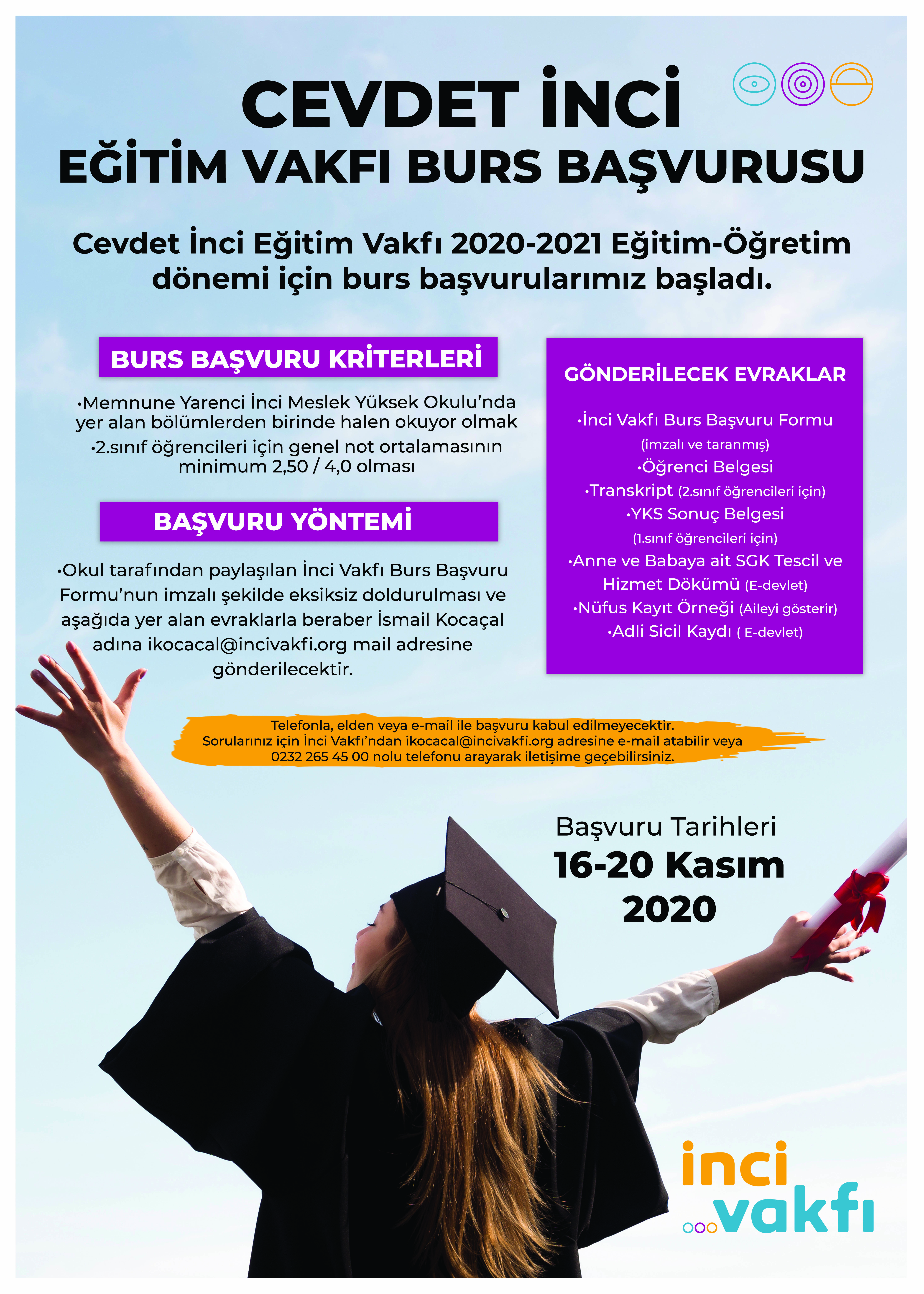 Cevdet İnci Eğitim Vakfı’nın Karacasu Memnune Yarenci İnci Meslek Yüksekokulu’na yönelik açmış olduğu eğitim bursu başvuruları 16-20 Kasım 2020 tarihleri arasında e-mail yoluyla gerçekleştirilecektir. Ekte bilgilendirme afişi ve Burs Başvuru Formu bilgilerinize sunulmuştur. Burs başvuru adımlarımızı aşağıdaki sizlerle paylaşmak isteriz: