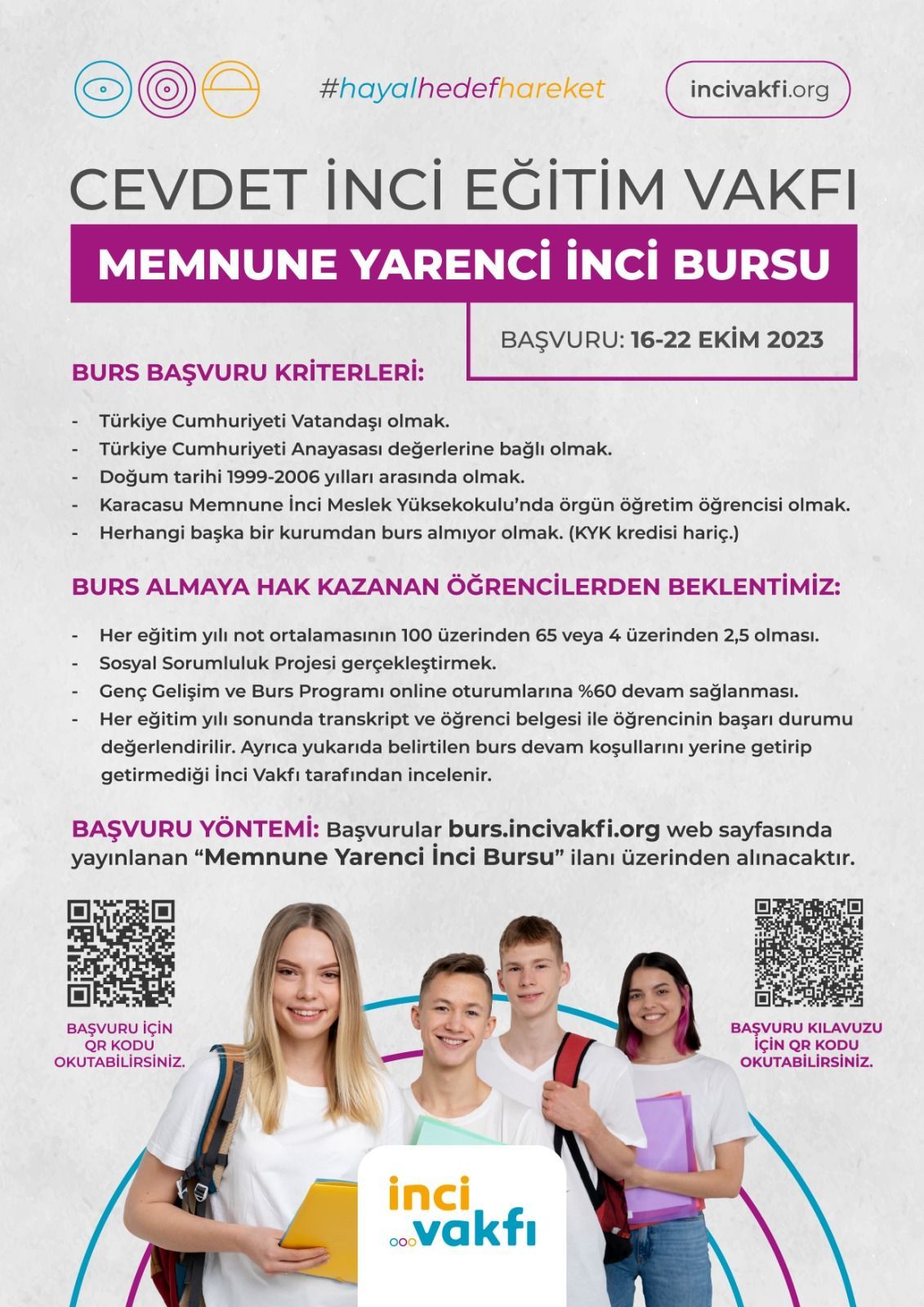 Başvurularınızı https://burs.incivakfi.org/login/ linkinden yapabilirsiniz. Ayrıca duyuru görsellerimiz ve başvuru kılavuzu görseldeki QR kodlarda yer almaktadır.
